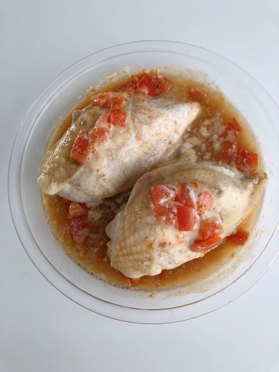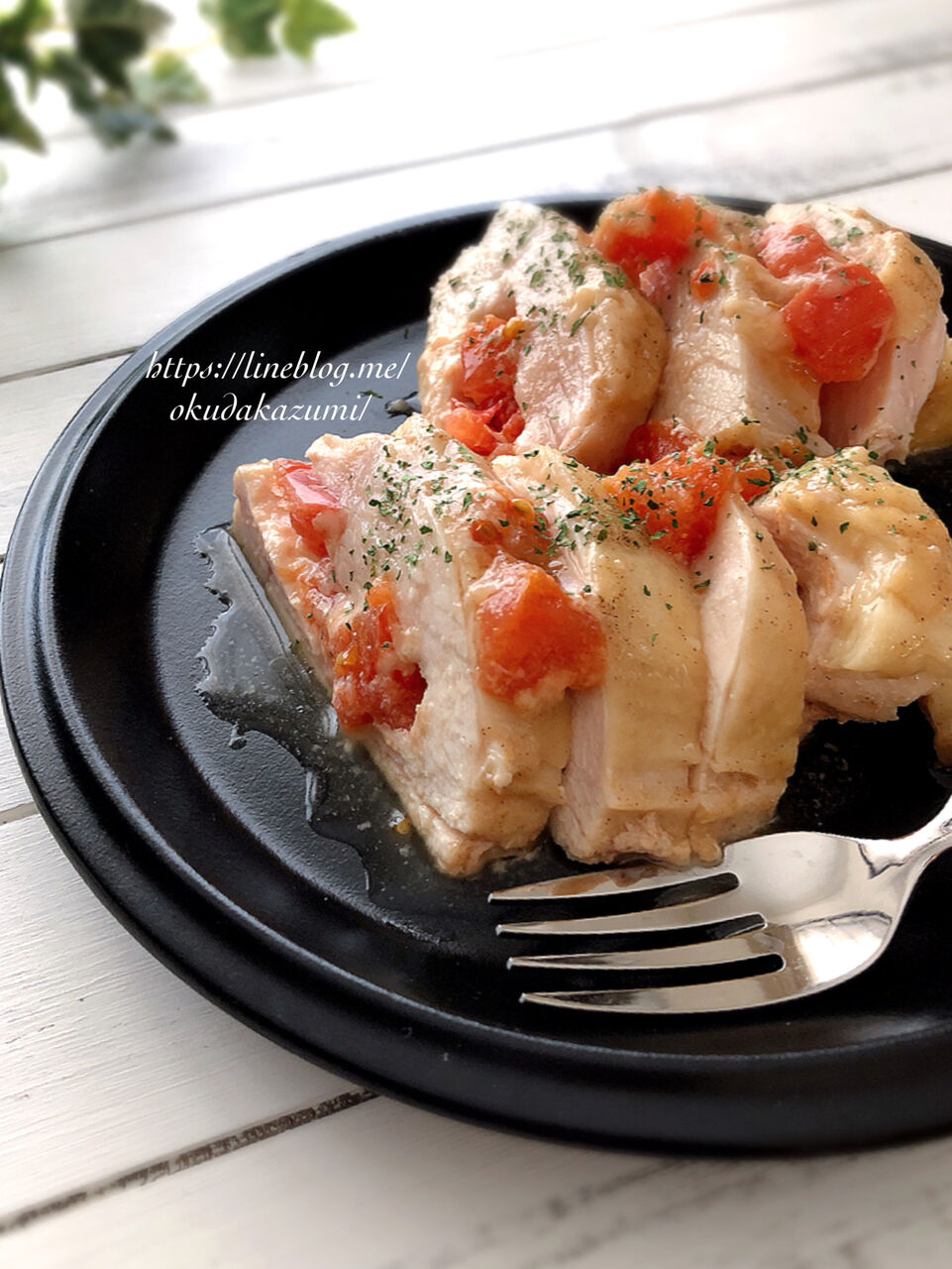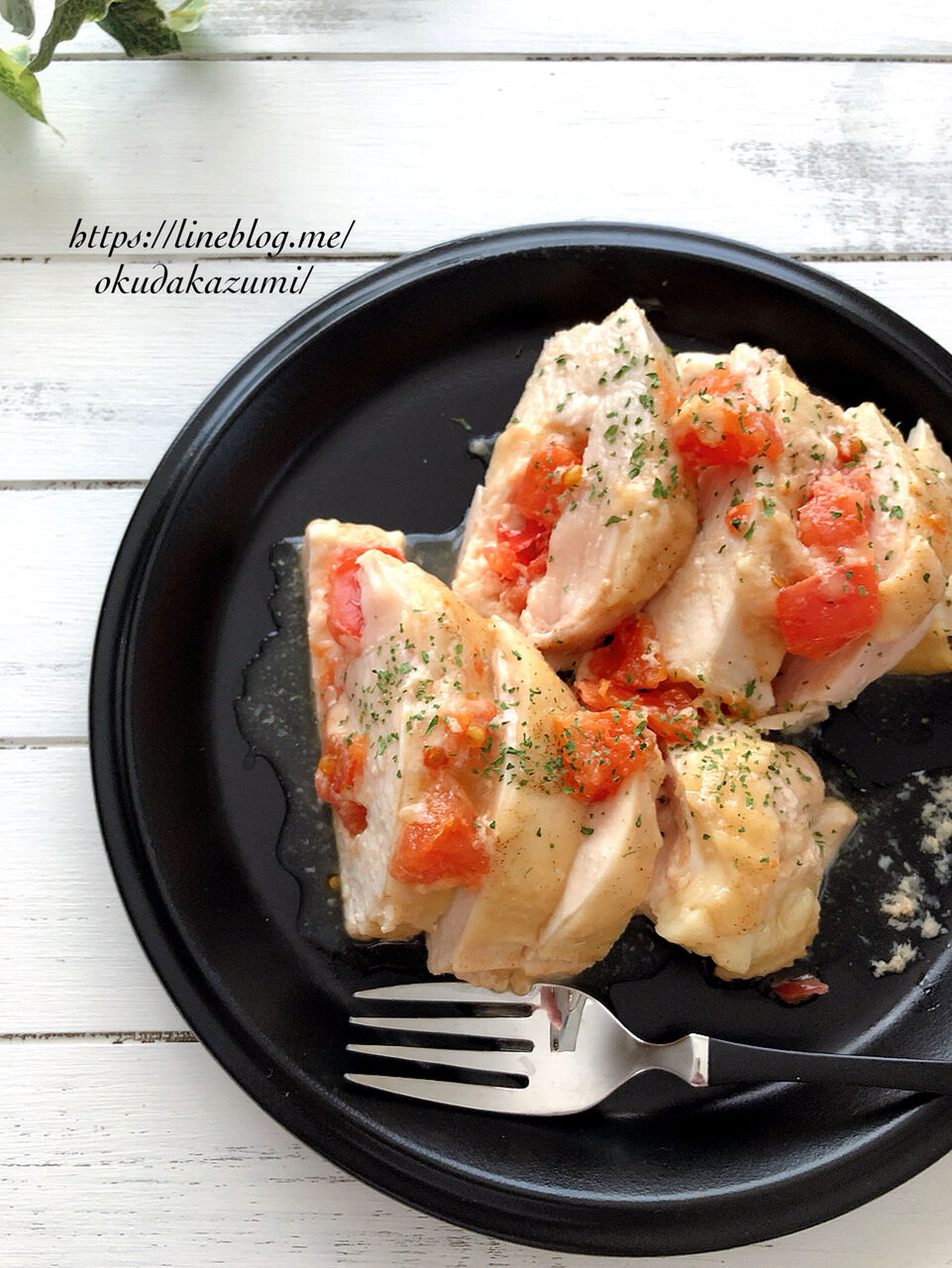 ①鶏胸肉の横から切り込みを入れ、開いたところにトマトとチーズを詰めて閉じる。これを2枚作る。