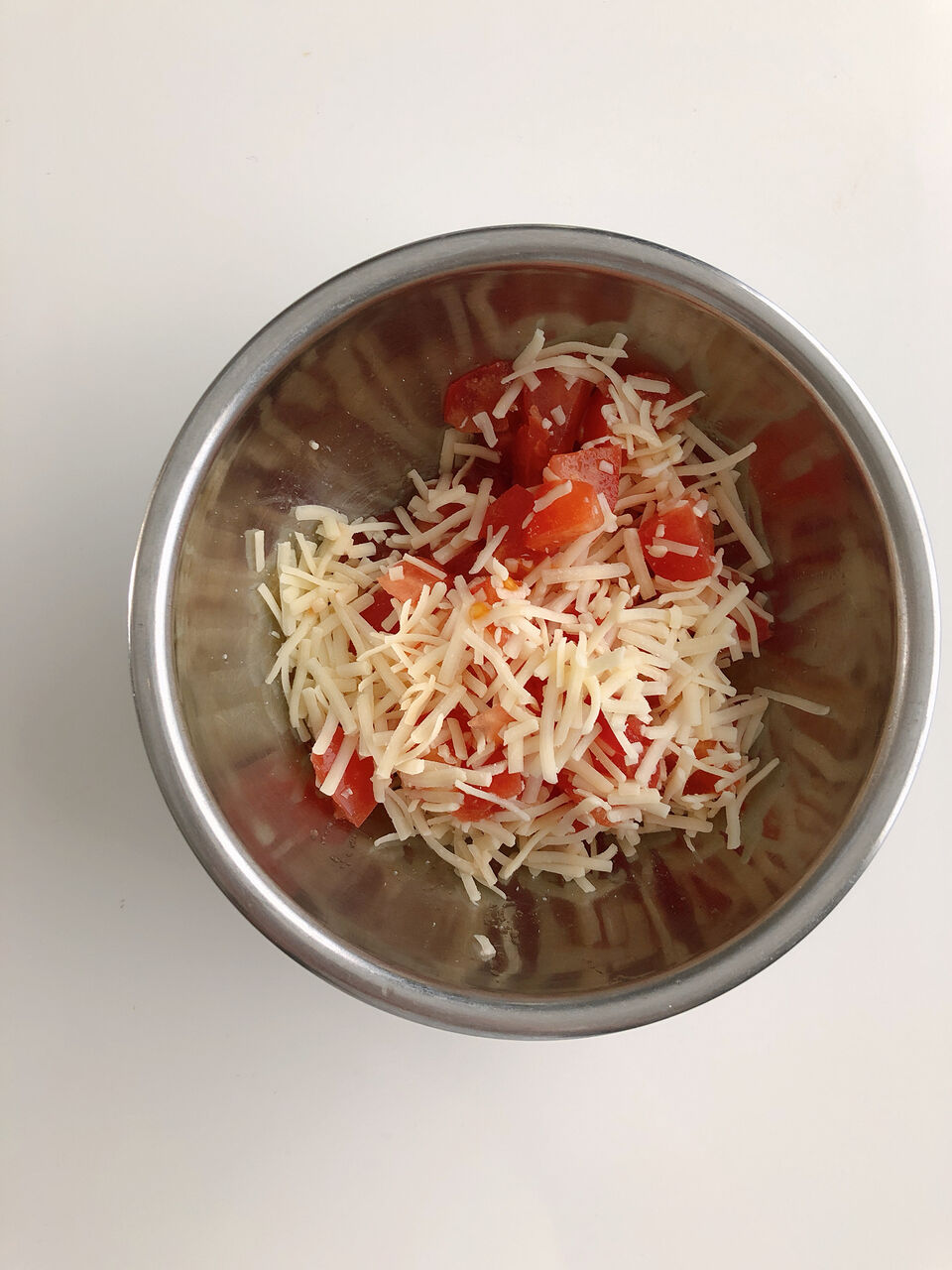 トマトとチーズは面倒でなければあらかじめ混ぜておいた方がチーズが均等に行き渡ってより美味しくなります。