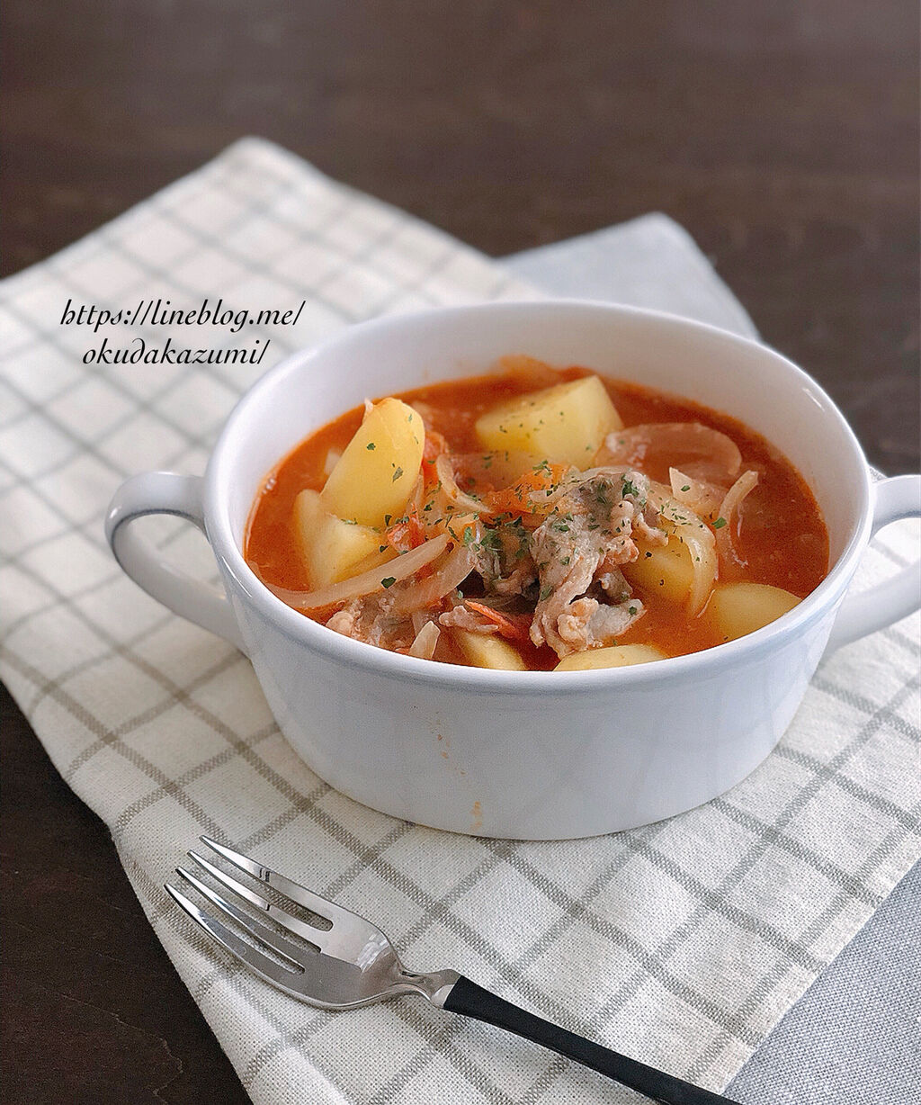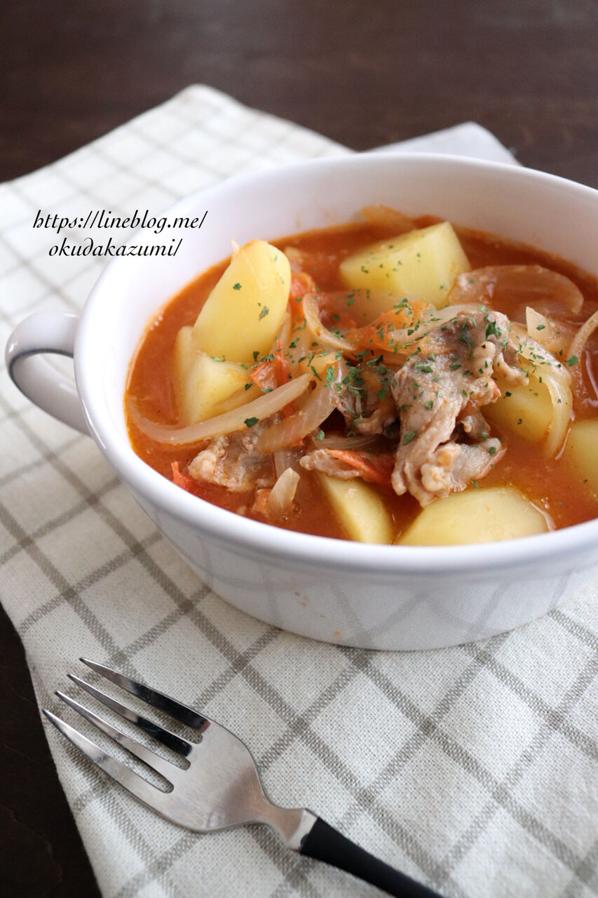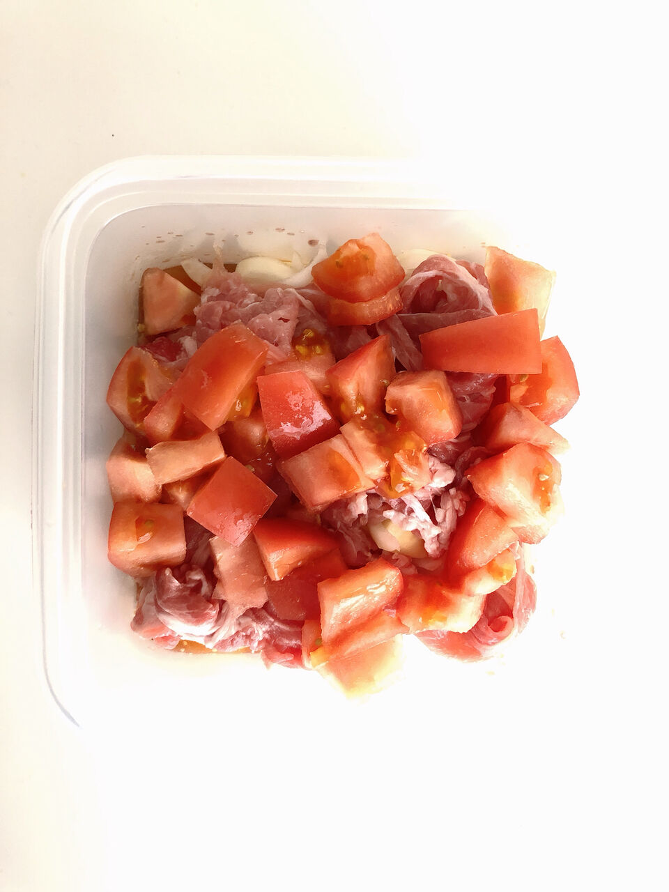 ①耐熱容器にAを入れて混ぜ、じゃがいも、玉ねぎを入れて豚肉を広げて乗せ、トマトを乗せる。