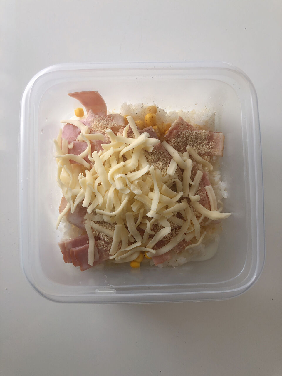 ①コンテナ(耐熱容器)にご飯を入れてベーコンとコーンを乗せ、Aを回しかけたらピザ用チーズをふぁさっと乗せる。