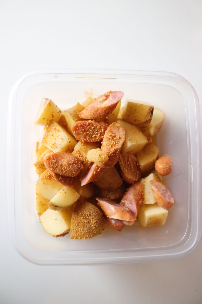 ②コンテナ(耐熱容器)に①とウインナーを入れてAをまわしかける。