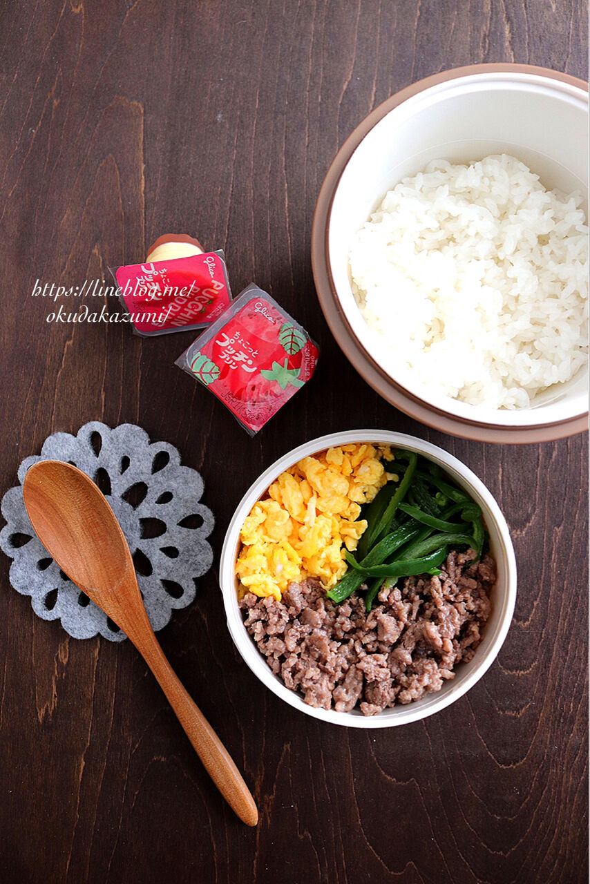保温弁当箱でほっかほかなご飯に、温かいそぼろを食べる前に乗せるスタイル。