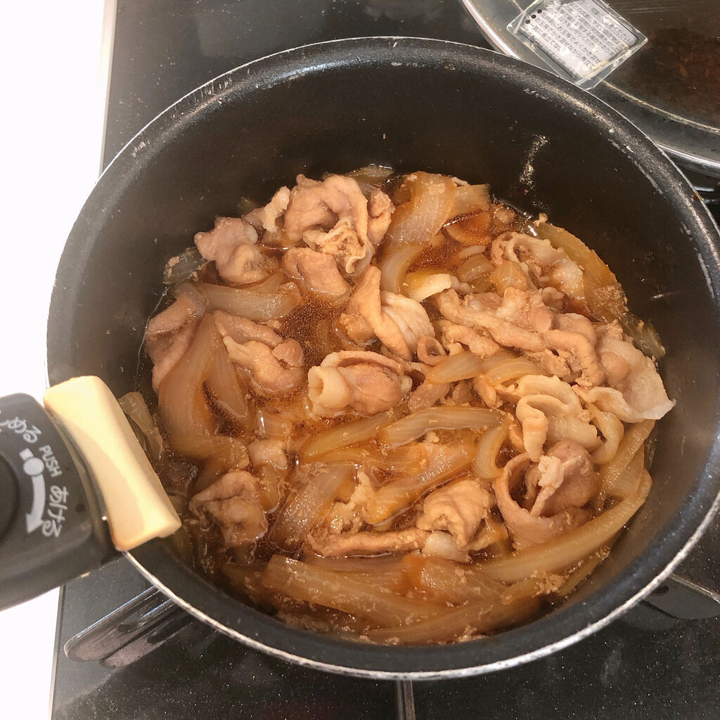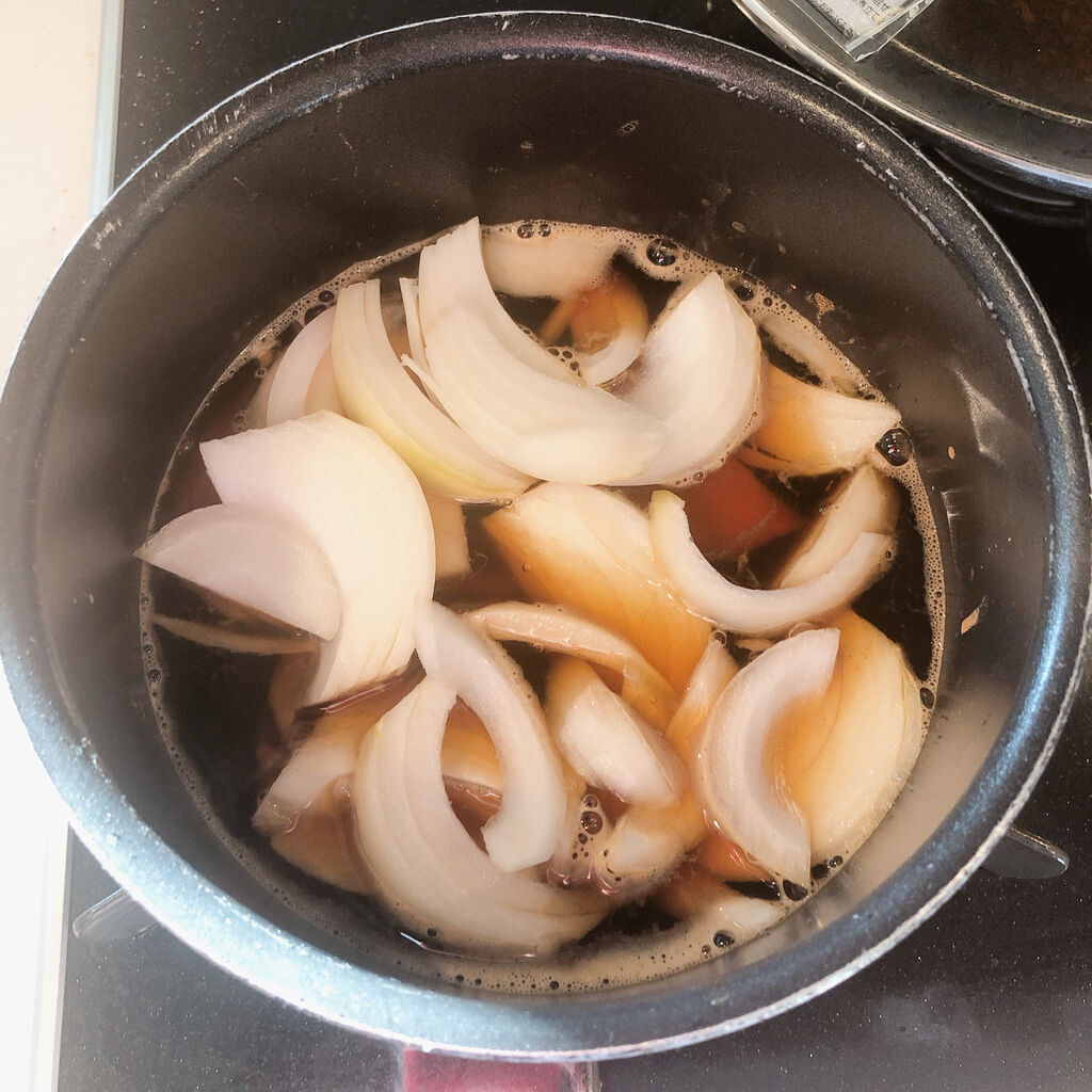 1.鍋にAを入れて中火にかけ、沸騰したら玉ねぎを入れ、しんなりしたら豚こま切れ肉を加えて(思い出したら時々混ぜて)15分煮る。