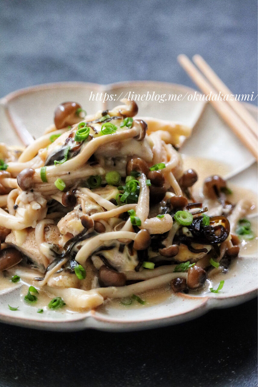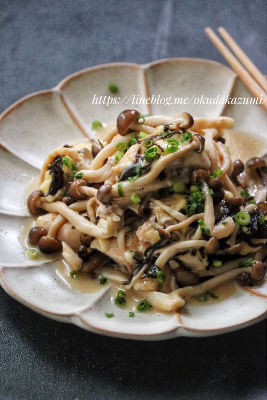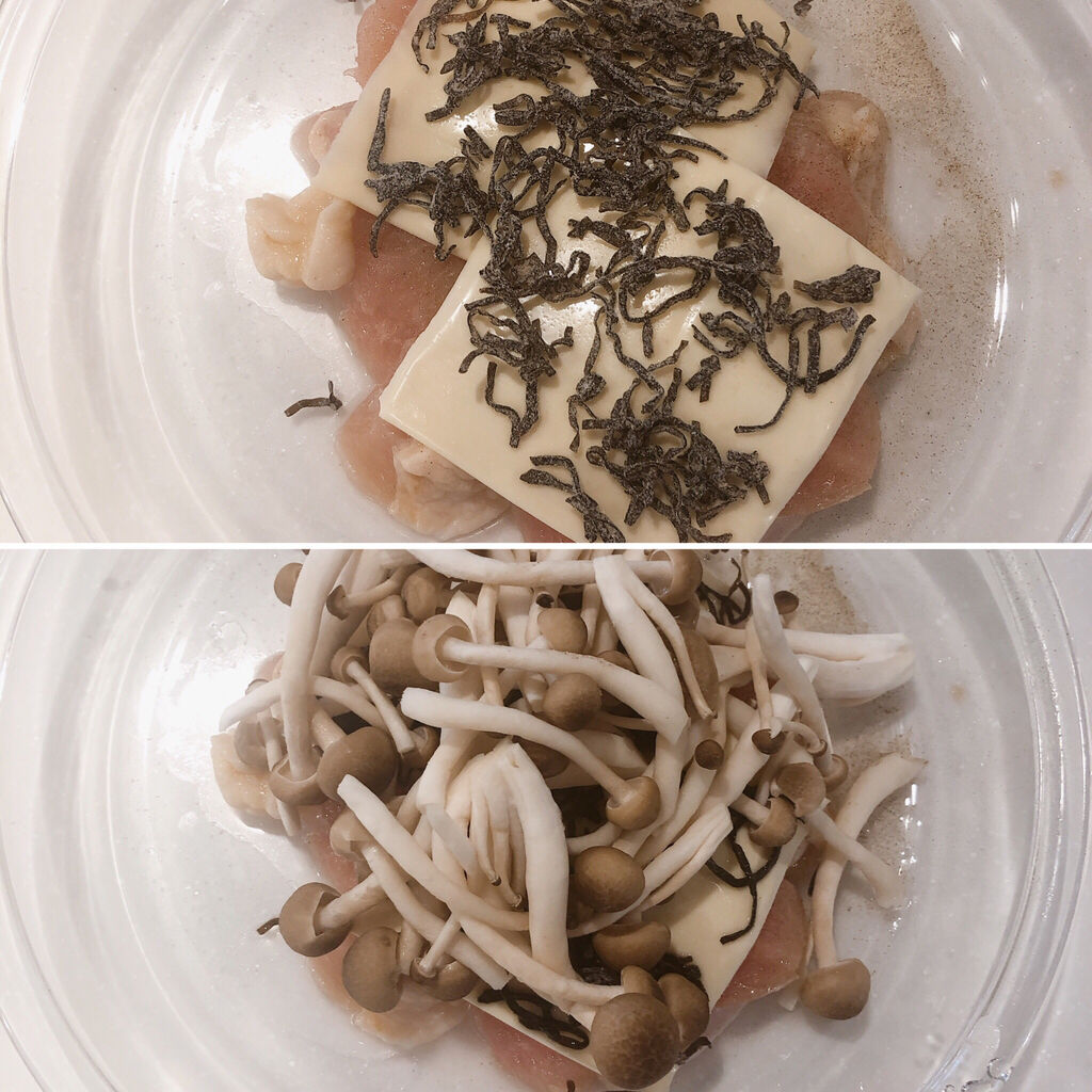 1.耐熱容器に鶏むね肉を並べて塩、こしょうを振り、スライスチーズを乗せて塩昆布を散らして酒を振りしめじを乗せる。