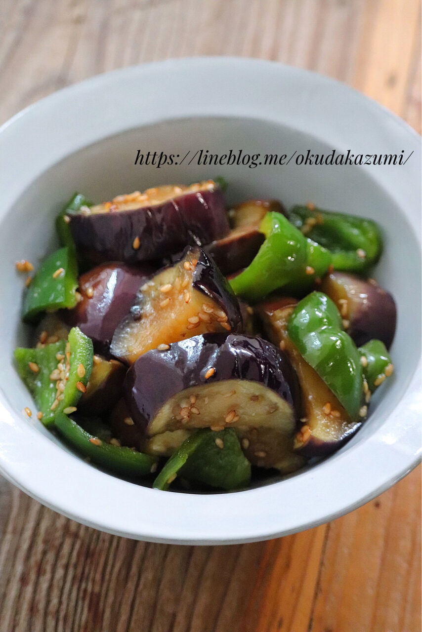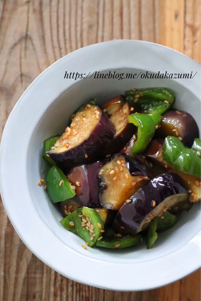 1.耐熱容器に茄子とピーマンを並べてごま油をまわしかけてよく絡め、さらにAをまわしかけてふんわりラップをかける。
