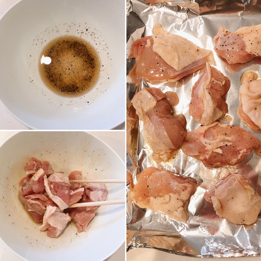 1.ボウルにAを入れて混ぜ、鶏もも肉を加えて絡める。(余ったタレは使います)