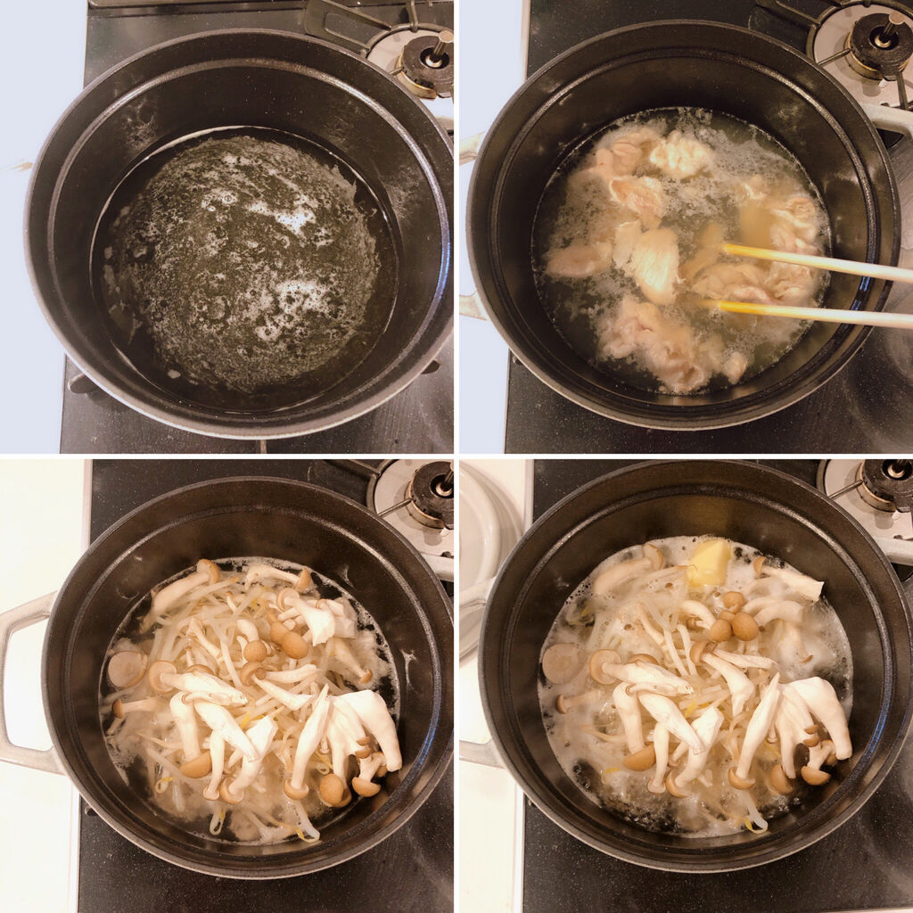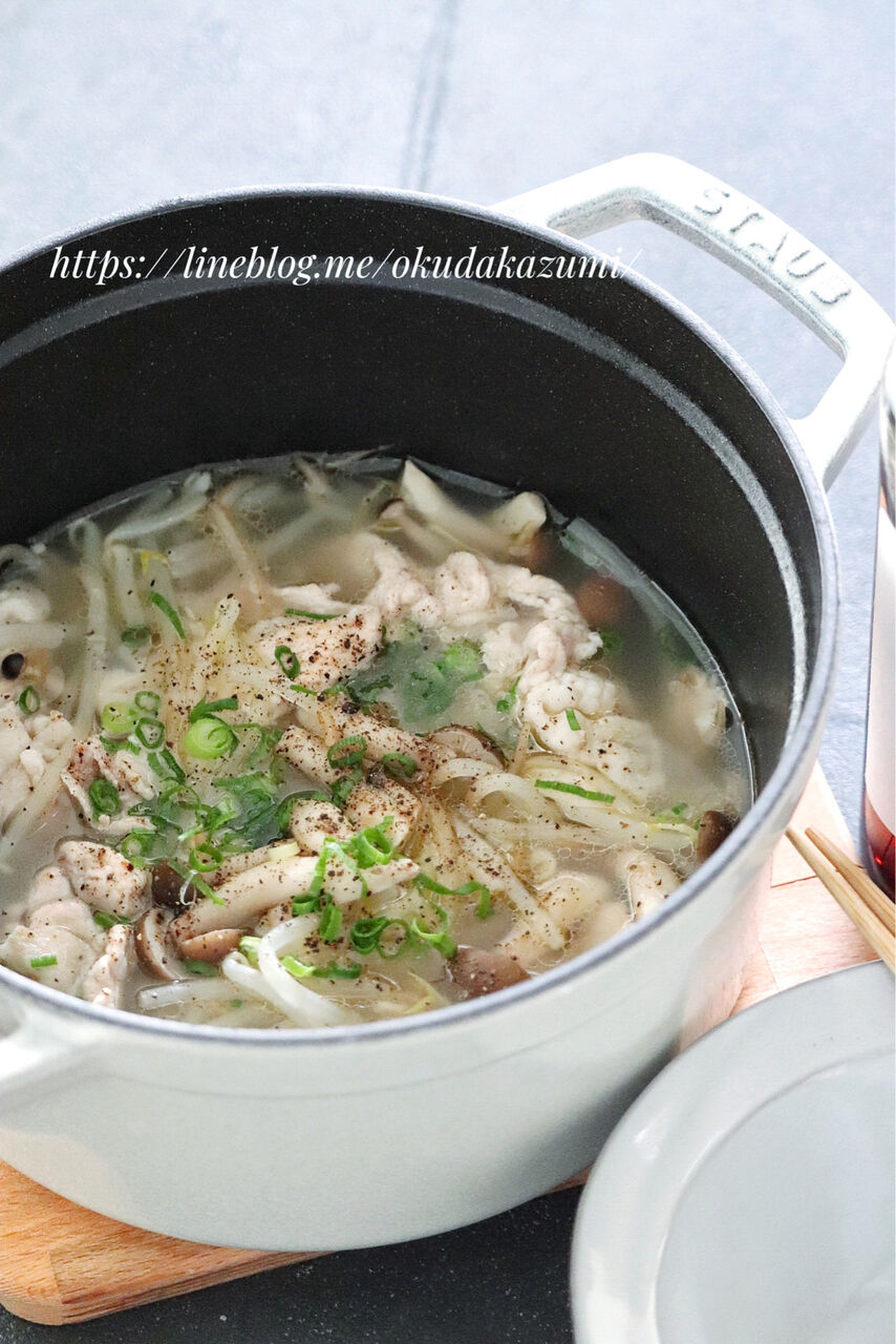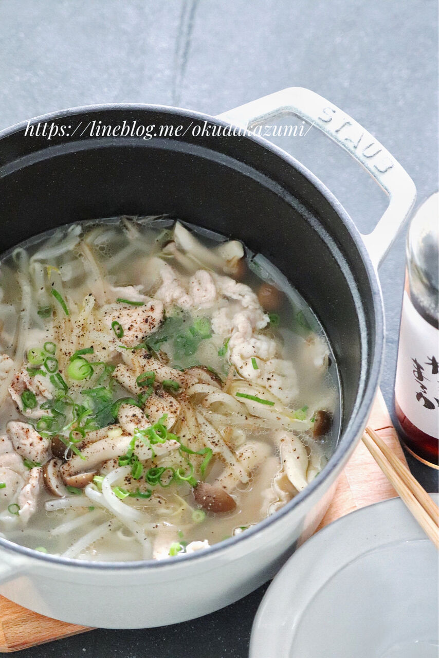 1.小鍋にAを入れて煮立たせ、豚肉、もやし、しめじの順で入れて再び沸騰したら少し隙間を開けて蓋をし、野菜に火が通るまで煮たら(5分くらい)粗挽き黒胡椒を振る。