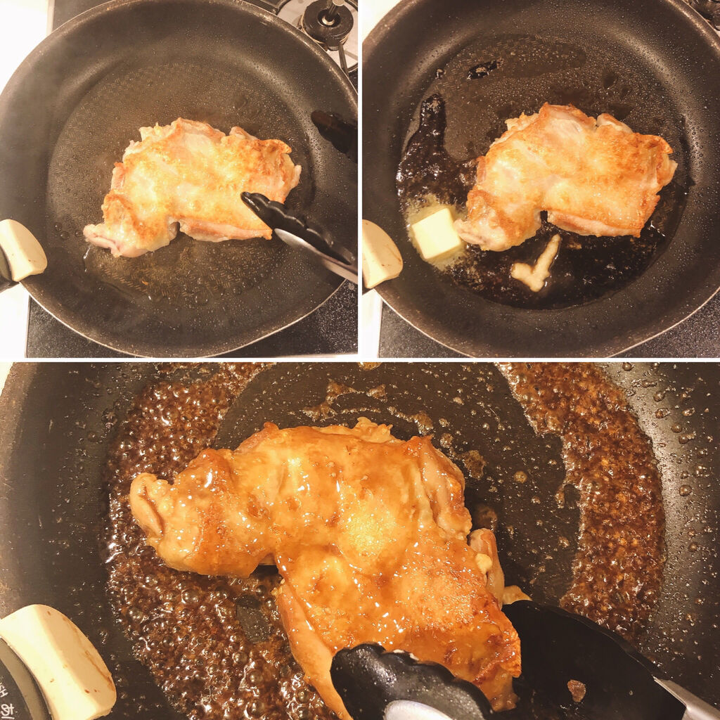 2.蓋を取って中火に戻したら端に寄せ、空いた場所にAを入れて溶かしながら鶏肉にしっかり絡めて適当な幅に切ったら器に盛り、フライパンに残ったタレをかける。
