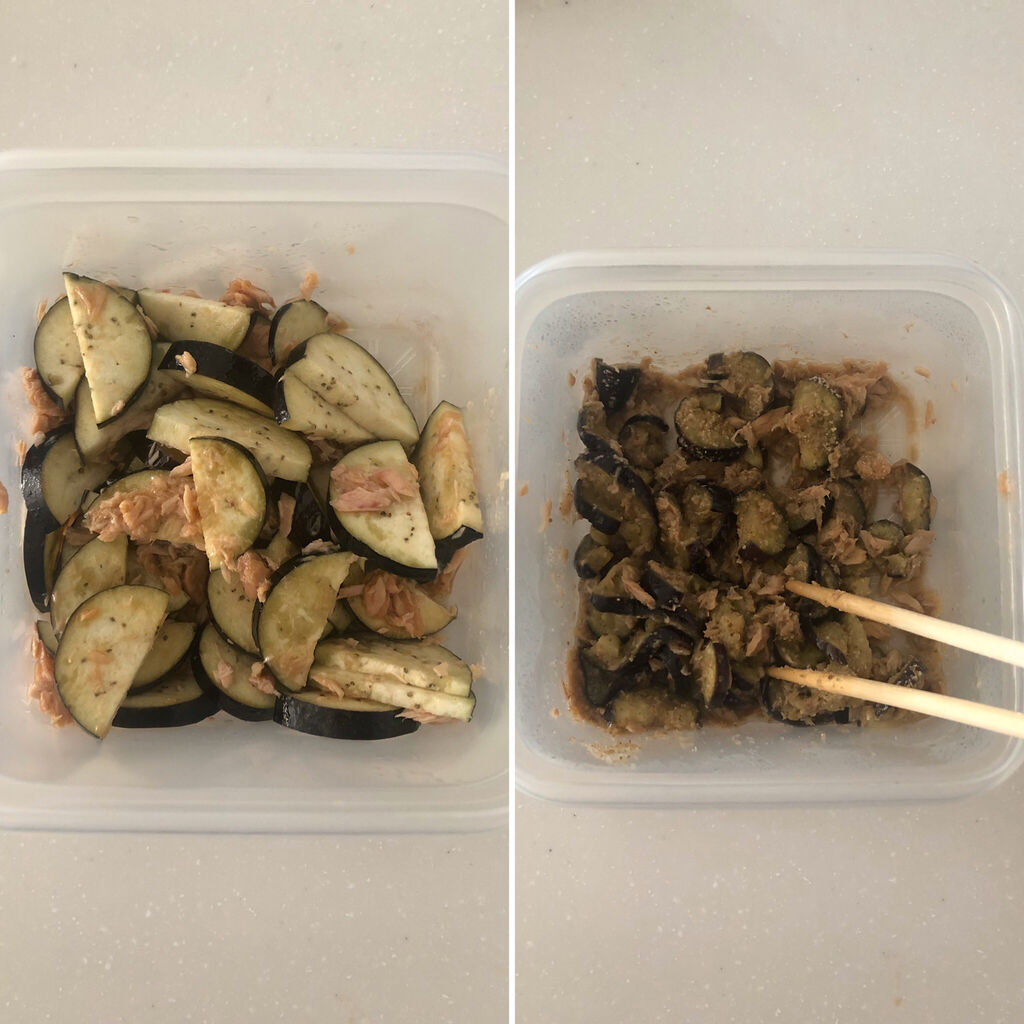 茄子を薄めに切ることで、しんなりしてツナとよく絡みます。