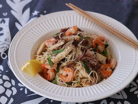 ちょっとパッタイ風の焼きビーフン風です。(なんんでも『風』言うとけばええと思って)