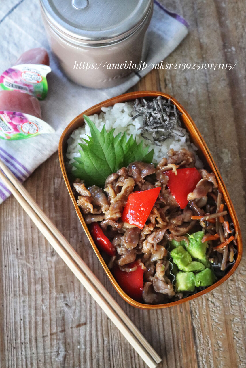 豚肉とパプリカの照り焼きときんぴらごぼうは昨日の晩ご飯の残りをチンしただけ。