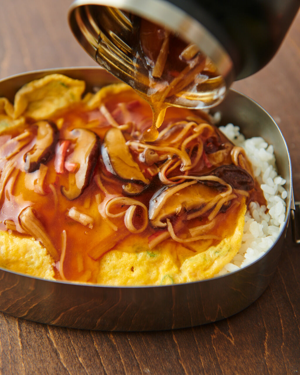 ご飯も、ぶっかける前提でお弁当箱の高さ3/1は空けておいた方が良いです。