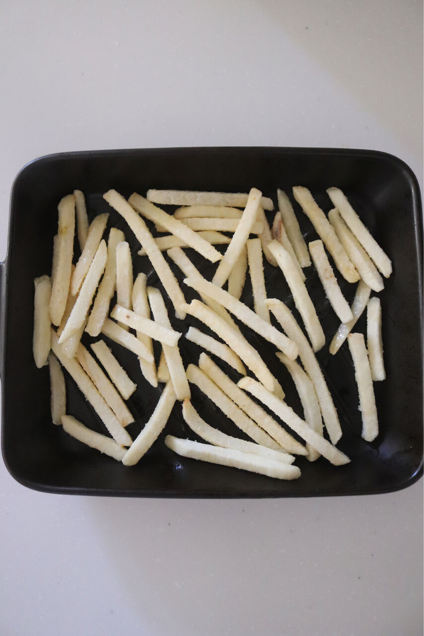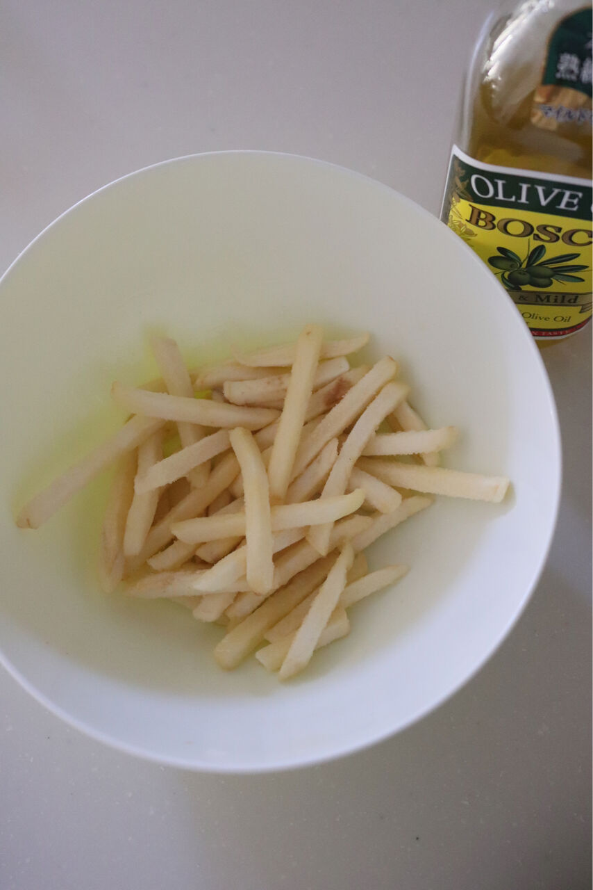 100gの冷凍フライドポテトに対して、オリーブオイル大さじ1を和える。(サラダ油可)