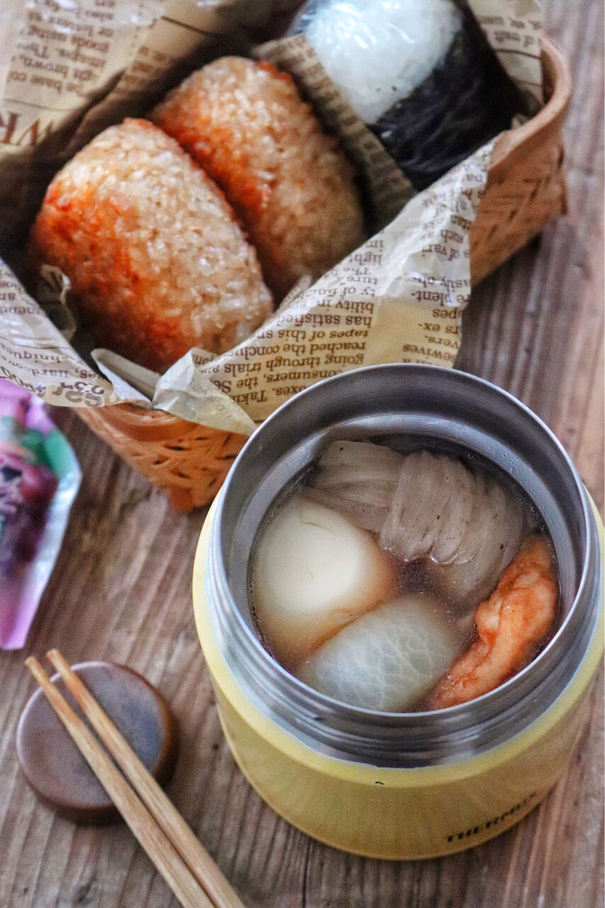 今日の次男弁当はおでん、焼きおにぎり、鮭おにぎり。