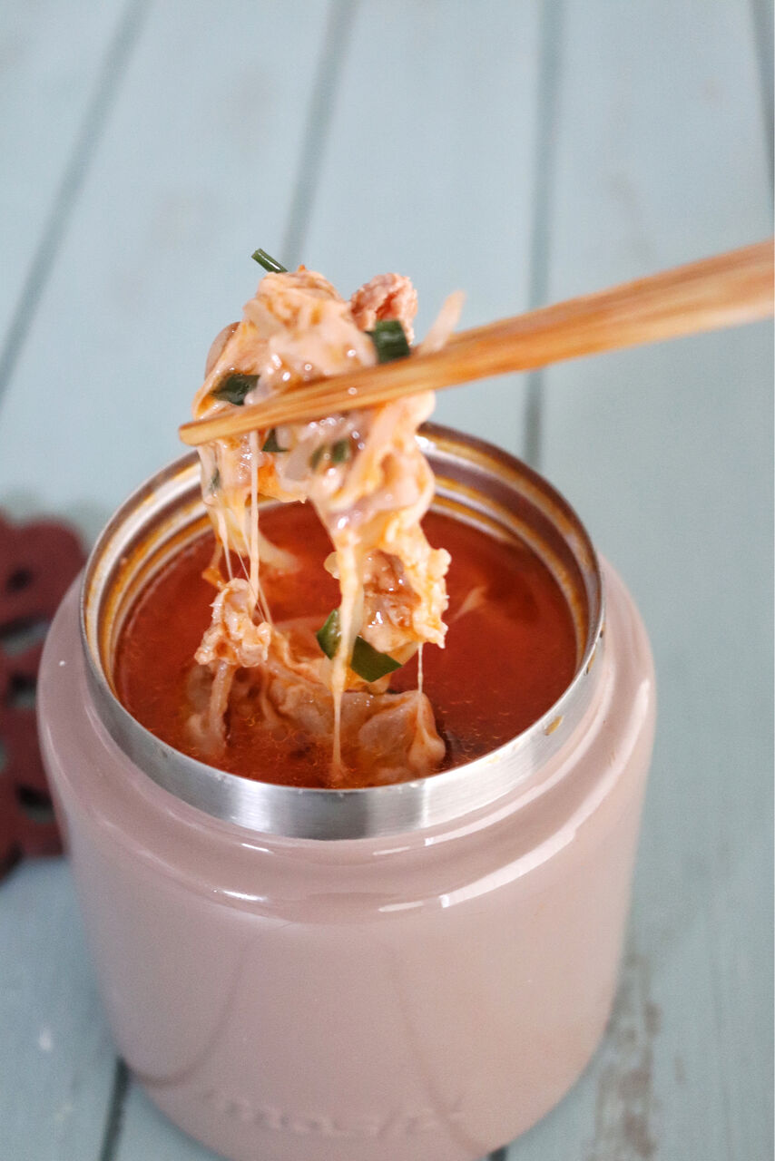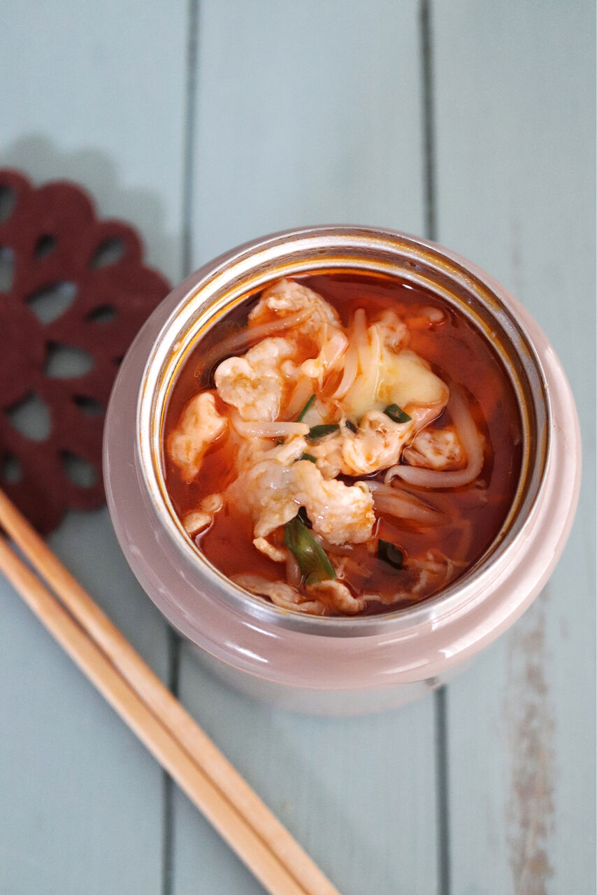 今回はキムチ鍋の素を1個使っただけでびっくりするくらい美味しいスープジャーレシピになったよ。(そらな)