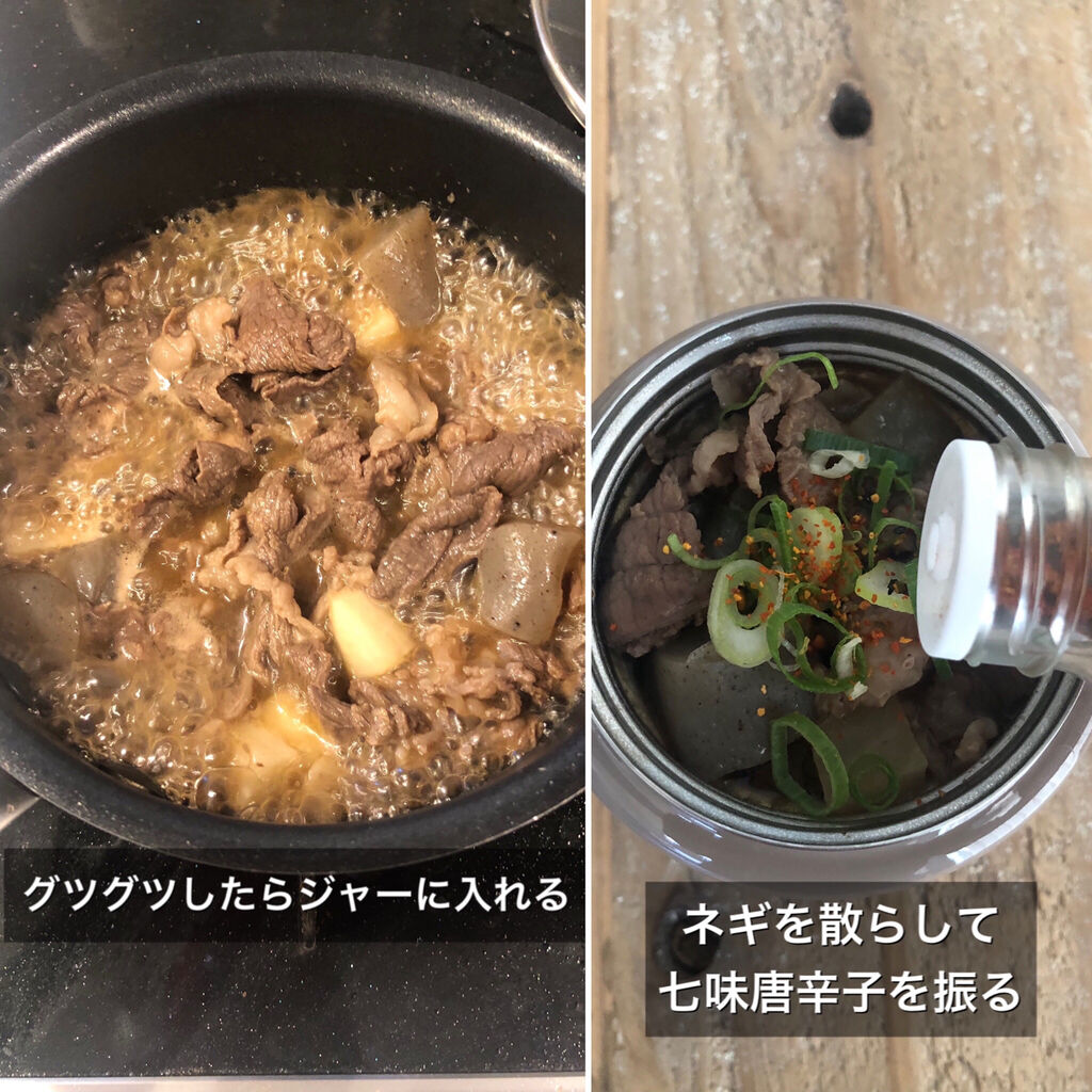 今回は牛こま切れ肉を使用して、満足感を得るために大根をプラスしました。うちはご飯にぶっかける系にして白いご飯と共にスープジャーに入れて持たせますが、