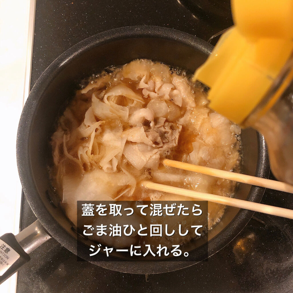 2.ふたをして中火にかけて3分煮たら混ぜ、ごま油をまわしかける。
