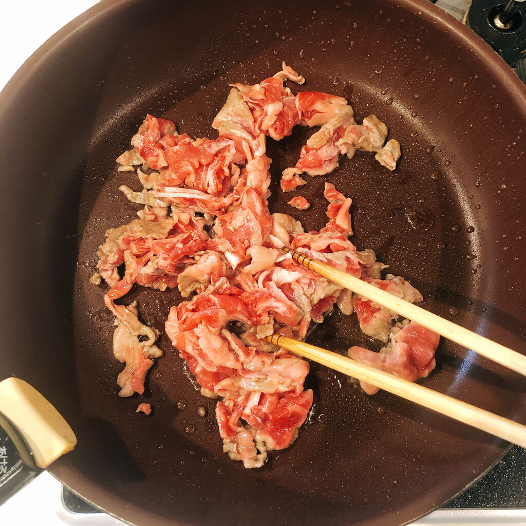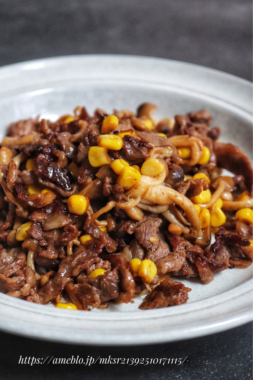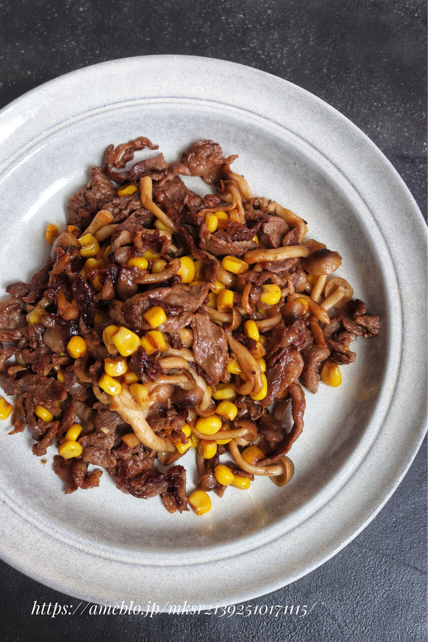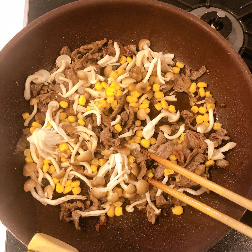 1.サラダ油を中火で熱したフライパンで牛肉を炒め、色が変わったらしめじとコーンを加えて炒める。