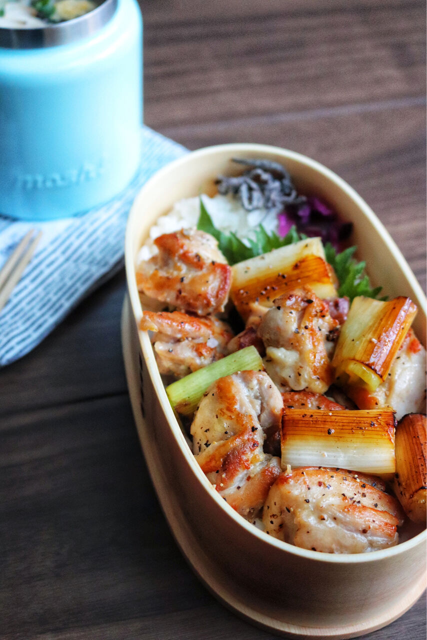 1品弁当としてお弁当に入れる時は、ネギはランダムに置いて下に大葉を敷くと華やかに。