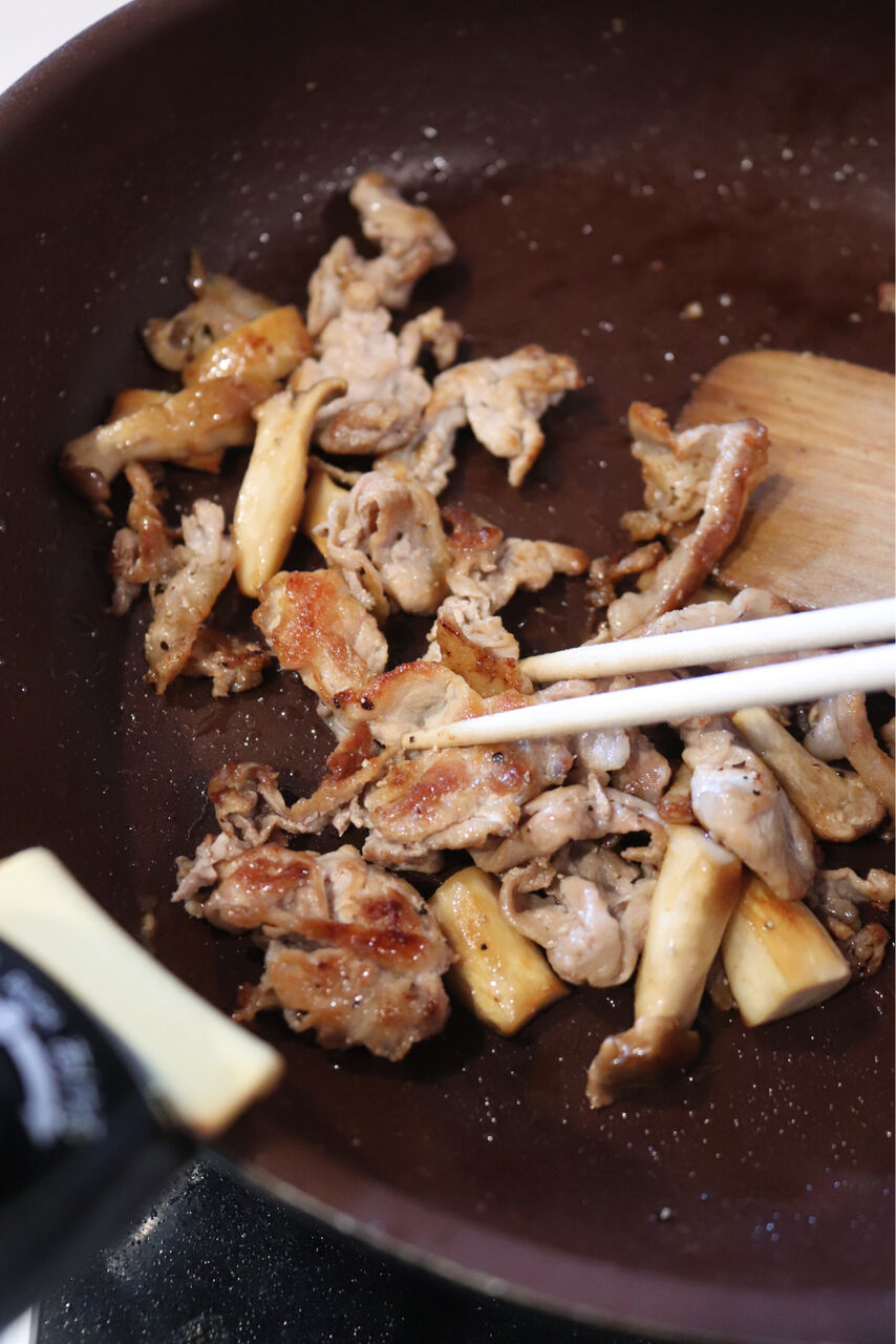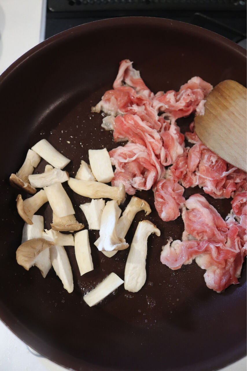 1.サラダ油を中火で熱したフライパンに豚こま切れ肉とエリンギを並べ、豚肉に焼き色がつくまで焼く。