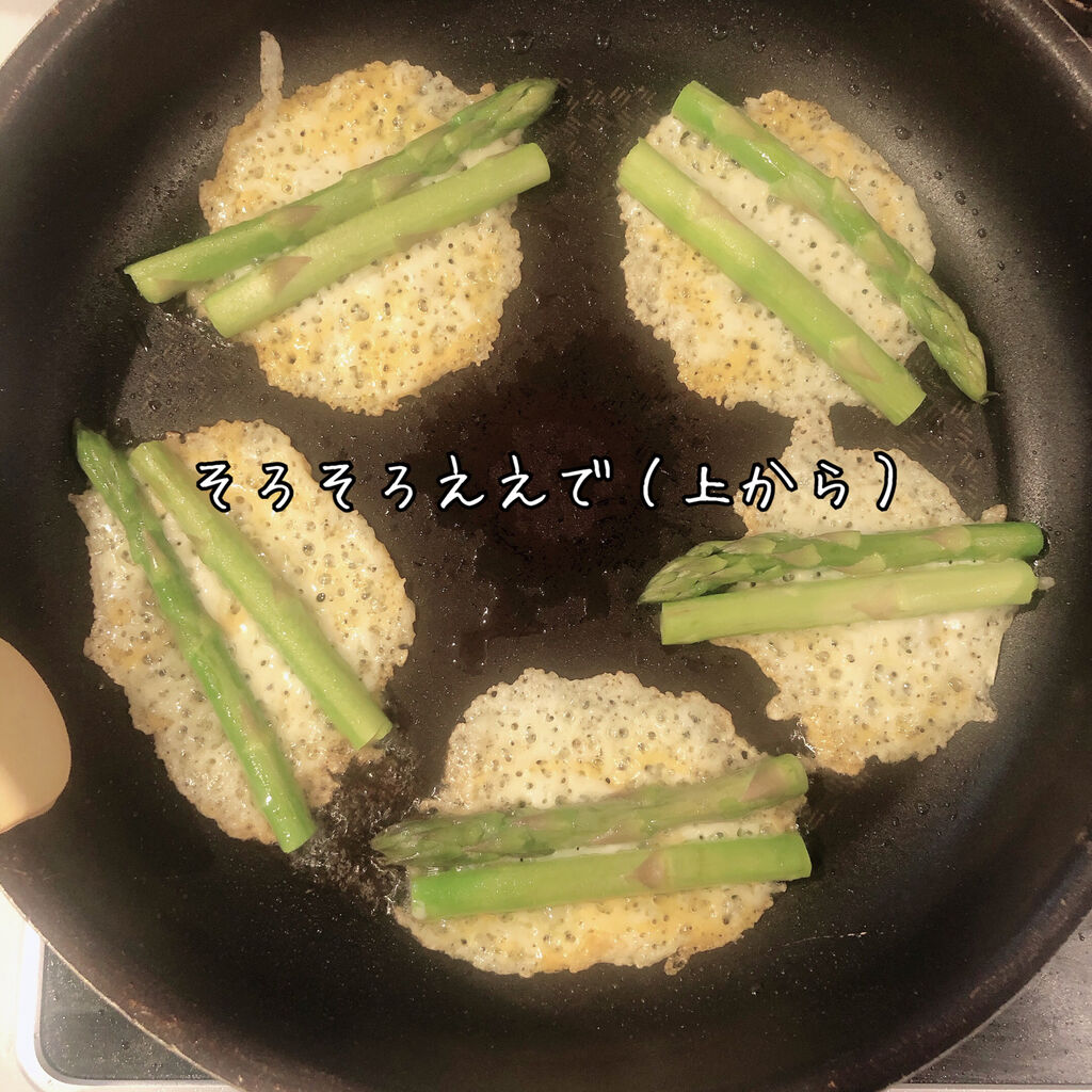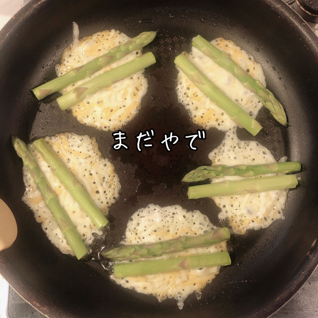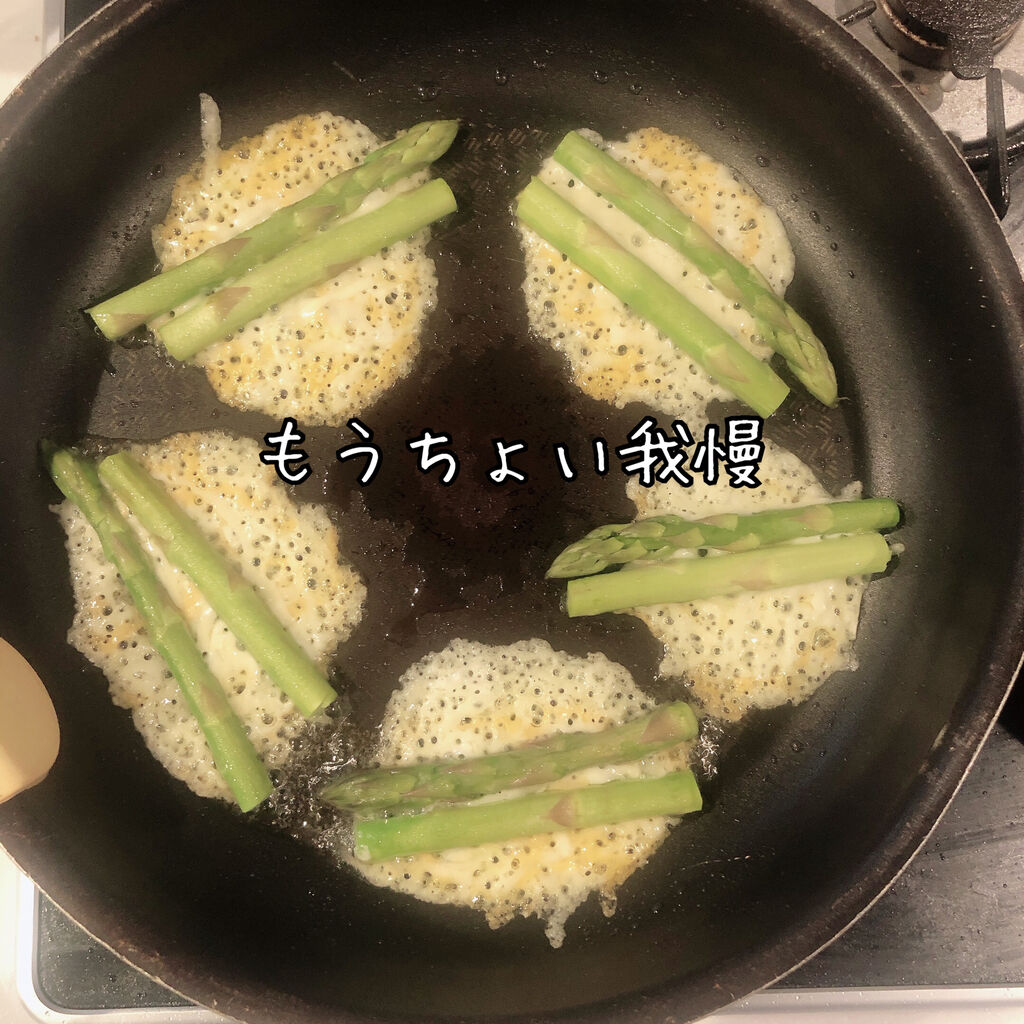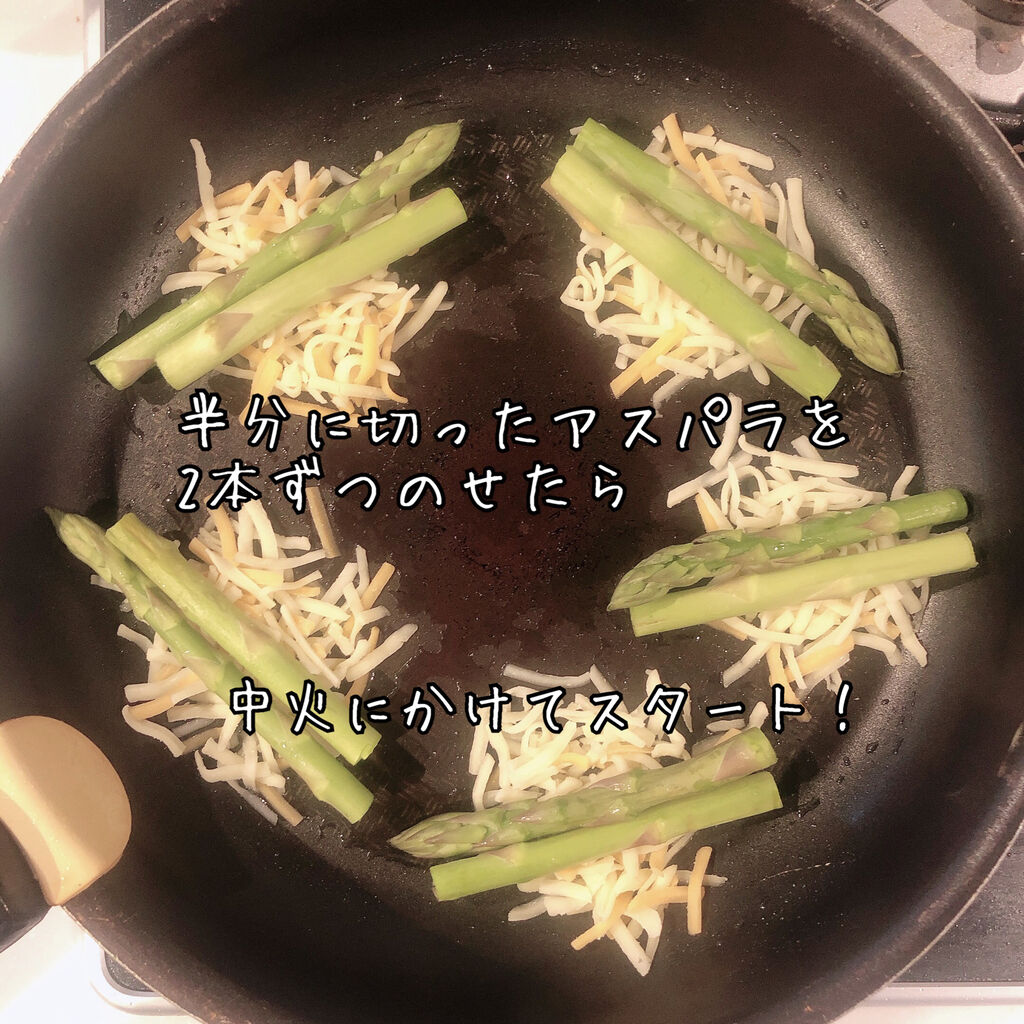 半分に切ったアスパラ(生のまま)を2本ずつのせたら中火にかけてスタート。