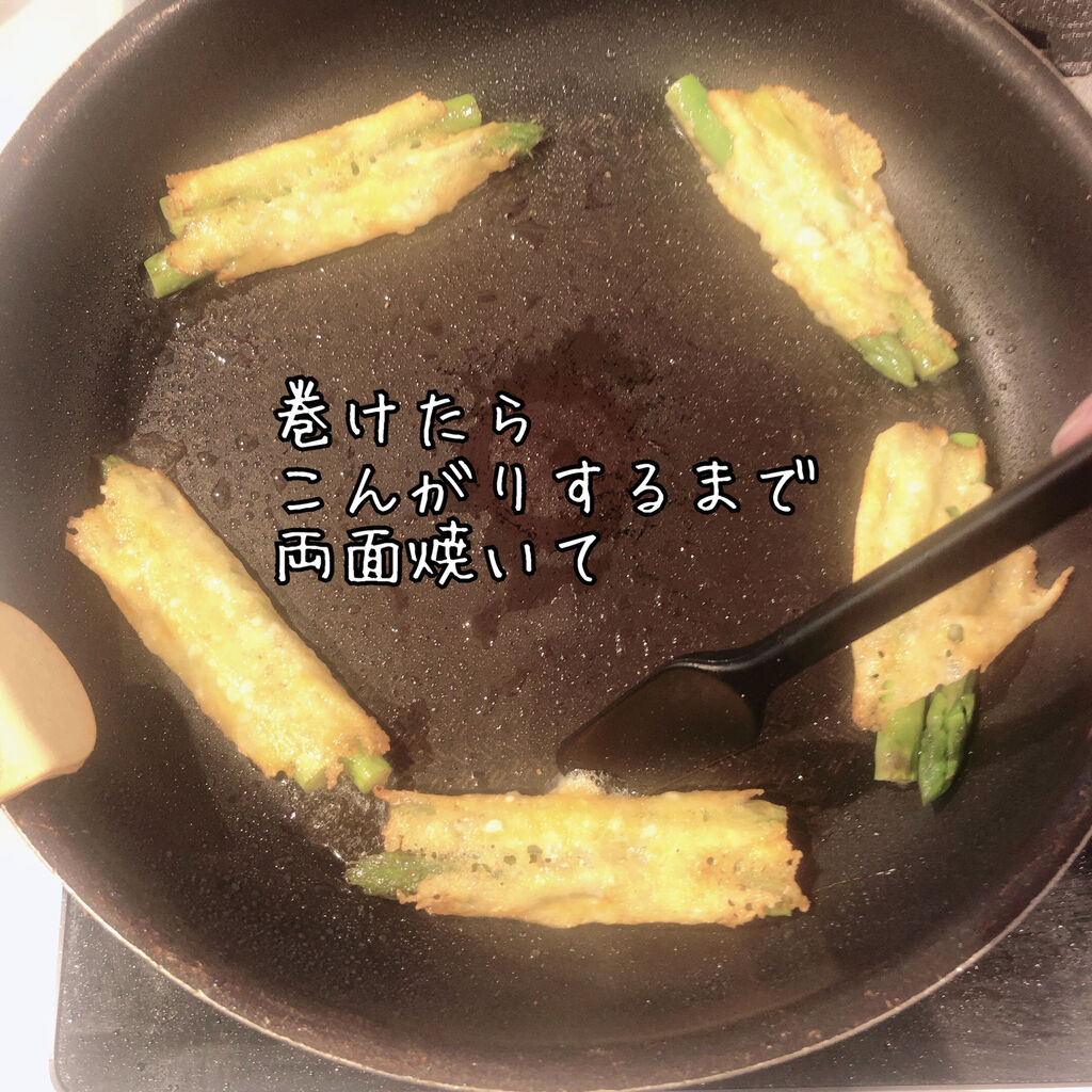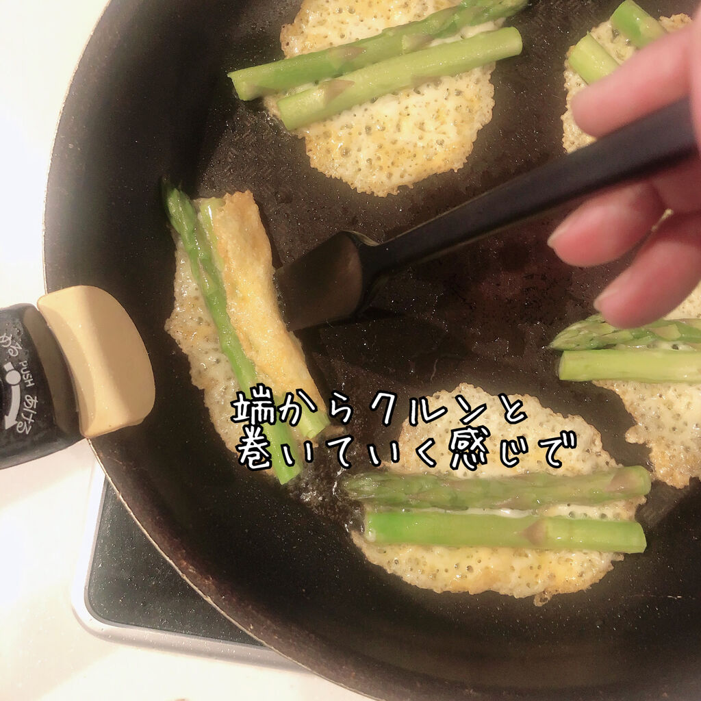 端からチーズを持ち上げて、アスパラを包みながらクルンと巻いて。