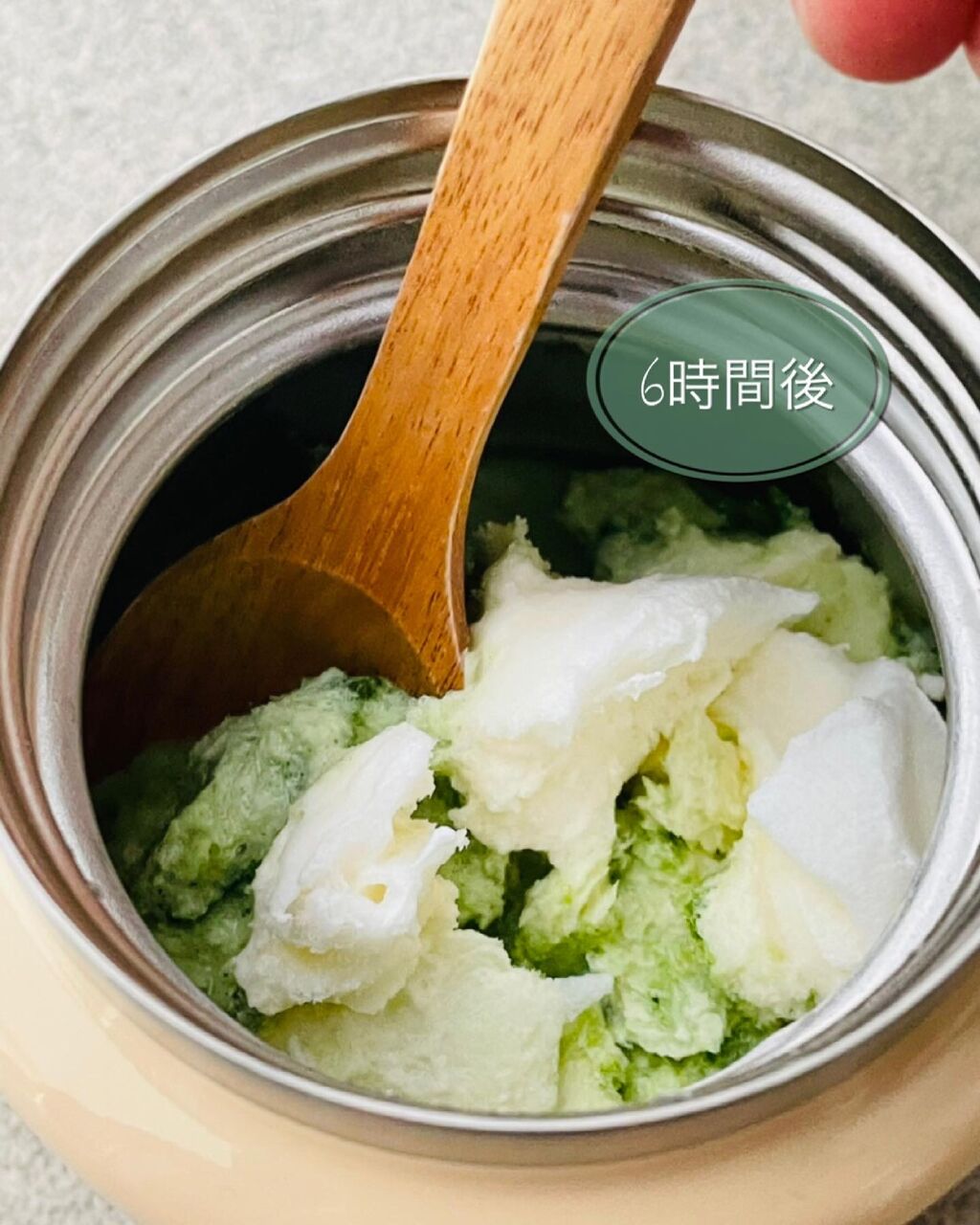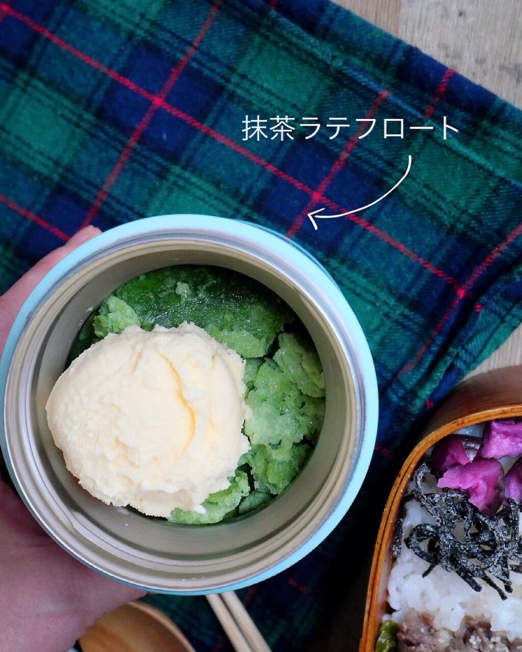 スープジャーをしっかり冷やし、凍ったものを下に入れてからバニラアイスなどをのせれば