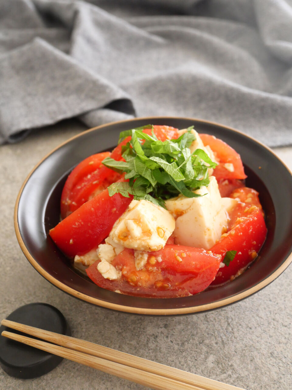 1.ボウルにAを入れて混ぜ、トマト、豆腐を加えてひと混ぜしたら器に盛り、大葉をのせる。