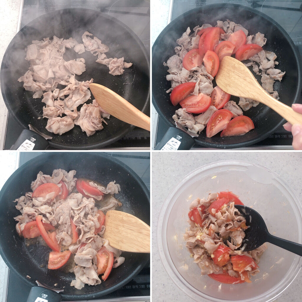 鶏肉に火が通ってからトマトを加えて炒めて下さい。
