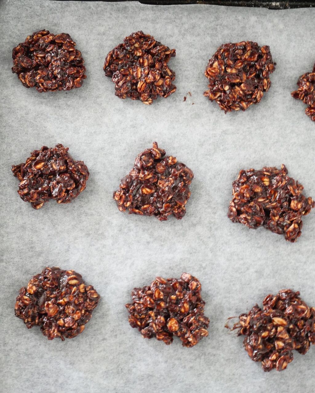 3.天板にオーブンシートを敷き、2をスプーン1杯分ずつ落として表面を軽く押さえて平らにし、180度のオーブンで17分焼いたらしっかり冷ます。
