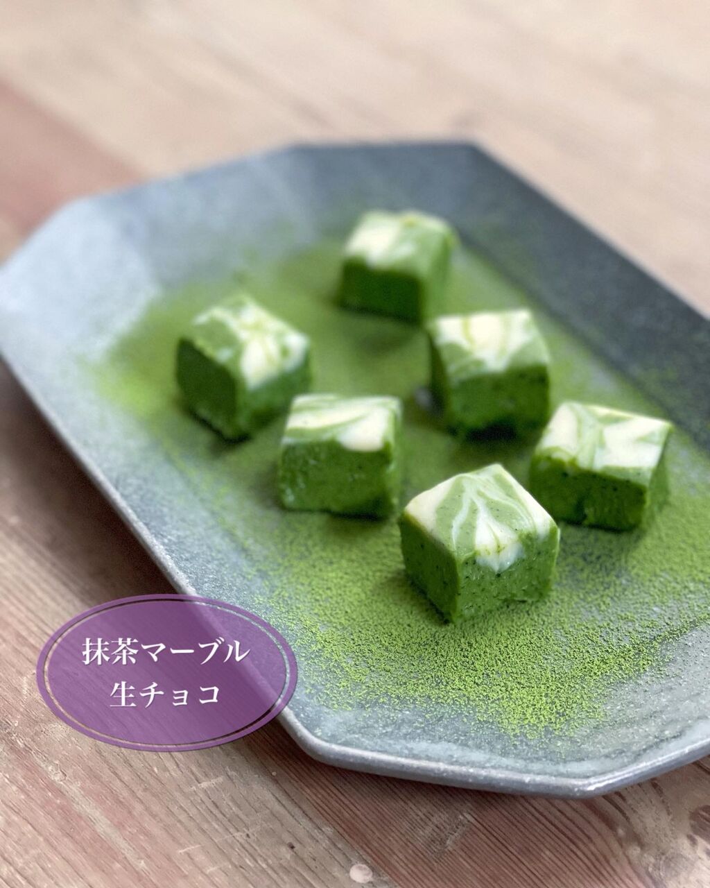 ✿お皿の下に抹茶パウダーを振っていますが、こうすることでお皿に生チョコがくっつきにくくなります