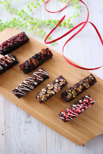 溶かしたチョコをポリ袋に入れて先端に少し穴を開け、絞り出してブラウニーにかけたら