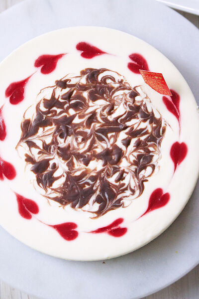 ボトムに使うために溶かしてよけておいたチョコと、ラズベリーソース(スーパーに売ってる苺ソースでも)をトッピング。