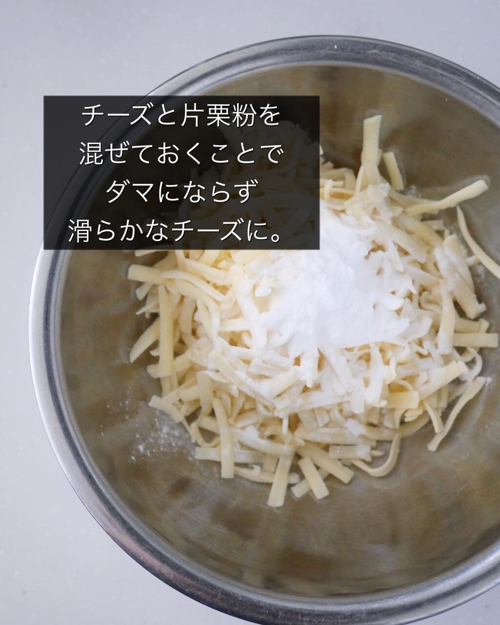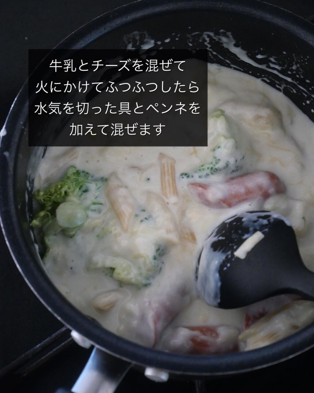 2.小鍋に牛乳、Bを入れて中火にかけ、チーズが溶けたら1を加えて混ぜる。