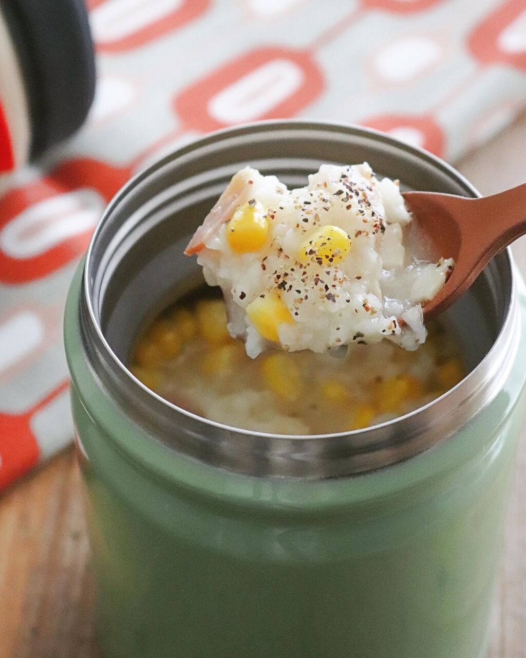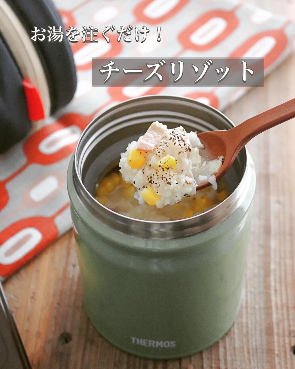 スープジャーで温めている間にぐんぐんお米にチーズの風味が浸透します。