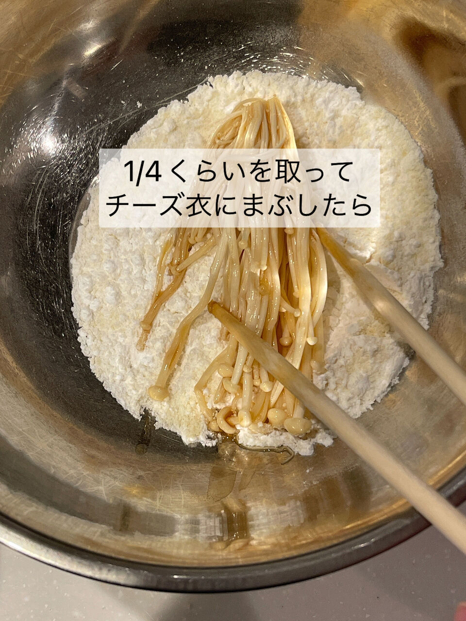 1.えのき茸の根元を切り、Aを入れた容器に広げてしっとりするまで浸ける。(片面各5分くらい)