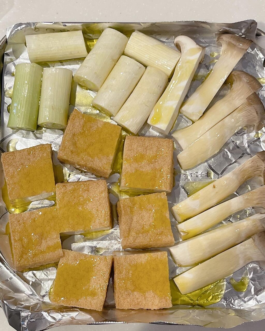 1.グリルの天板にアルミホイルを敷き、厚揚げ、ネギ、エリンギを並べたら全体にオリーブオイルをかけ、グリルで7分ほど焼く。
