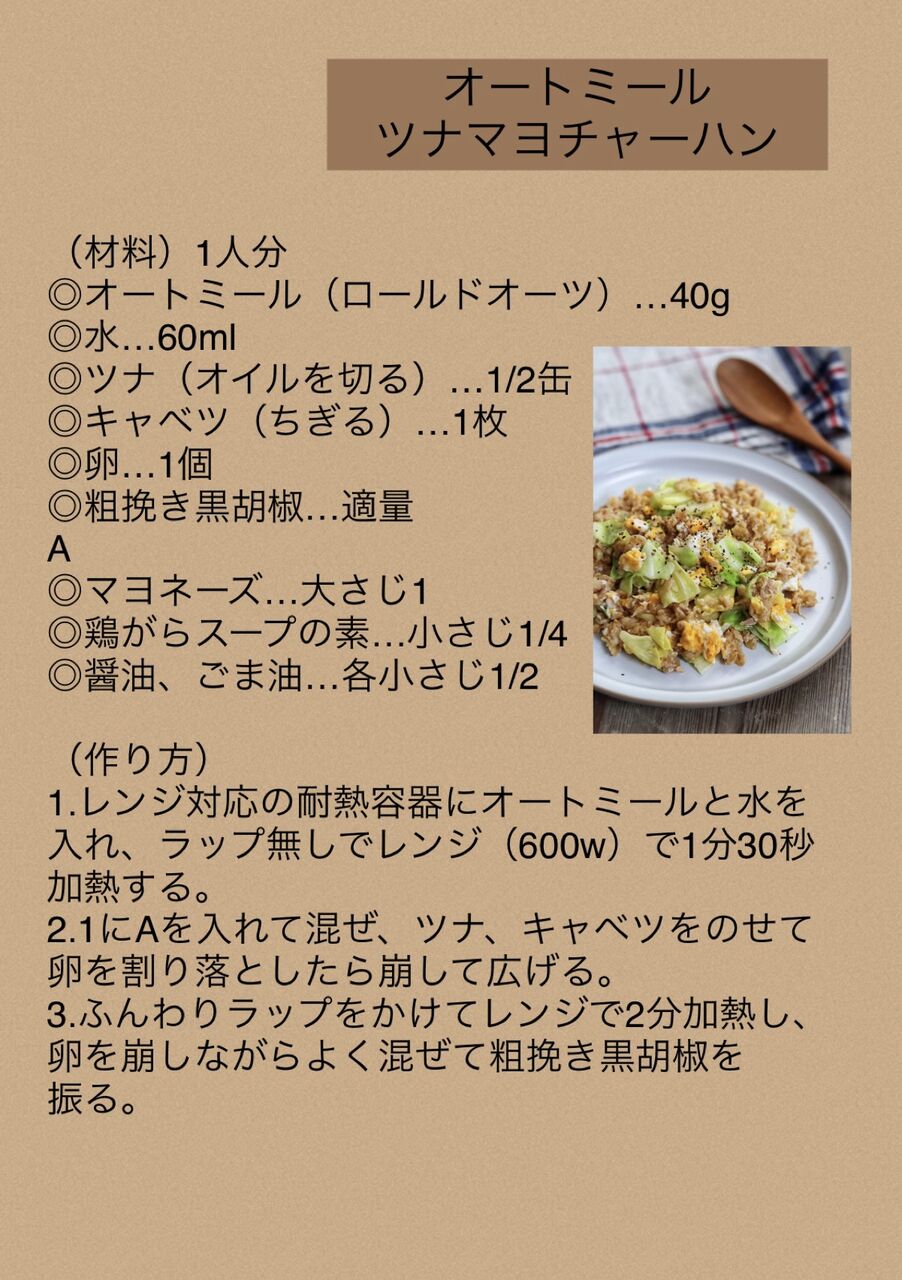 1.レンジ対応の耐熱容器にオートミールと水を入れ、ラップ無しでレンジ(600w)で1分30秒加熱する。