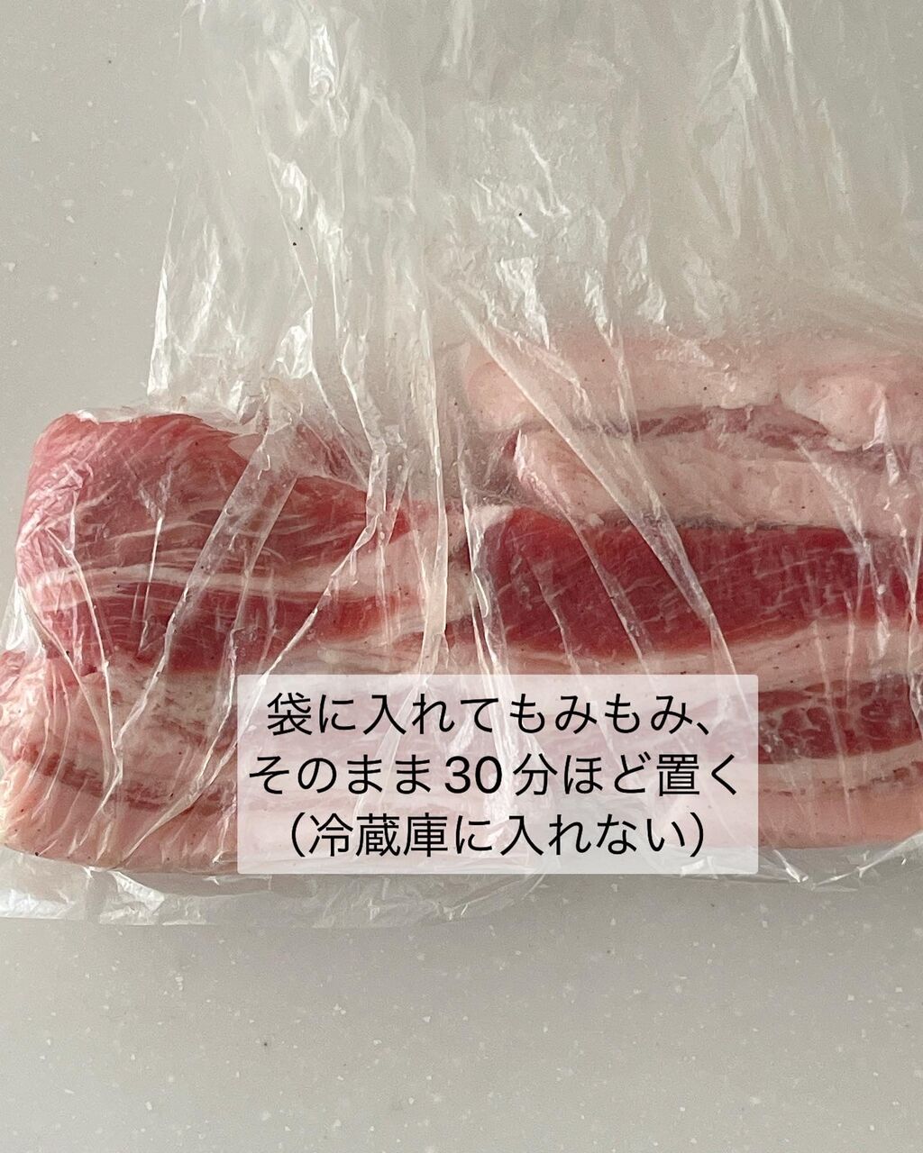1.豚肉に数カ所フォークなどで穴を開け、Aと共にポリ袋に入れたらよく揉んで常温で30分ほど置く。