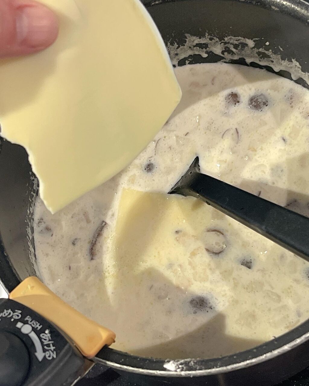 3.2にAを加えてふつふつして来たらスライスチーズを加えて溶かし、器に盛って粗挽き黒胡椒を振る。