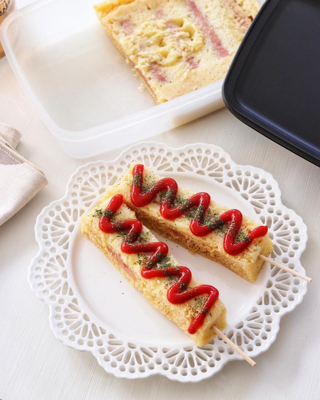 まず1つは、角型で浅く広い容器の中で混ぜてチン→容器の中で取り分けるだけの、超超簡単なアメリカンドッグ。