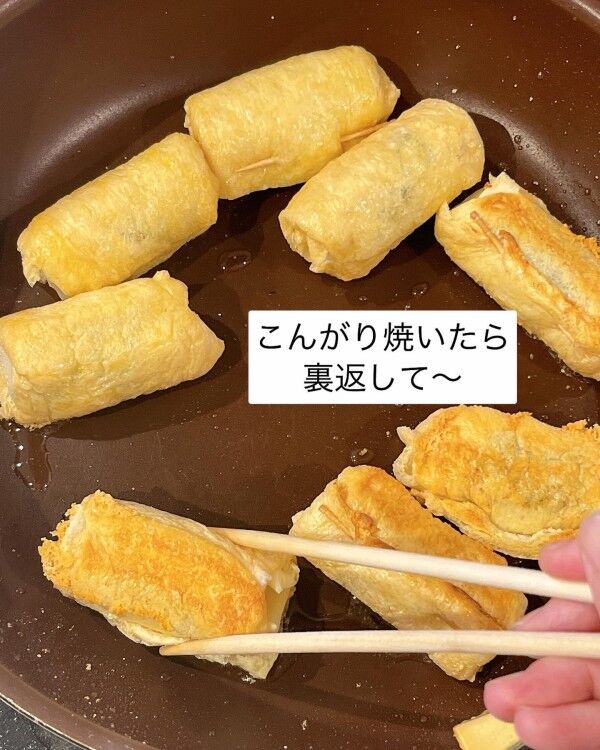✳️油揚げを開く前に、麺棒で生地を広げるイメージでお箸などでコロコロと転がすと中が開きやすくなります。