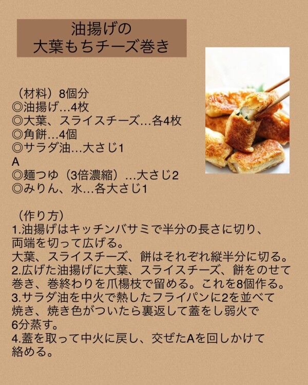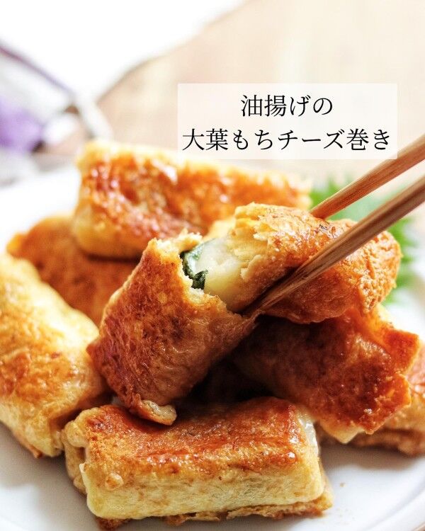 広げた油揚げでお餅と大葉とチーズをクルクル巻くだけ。