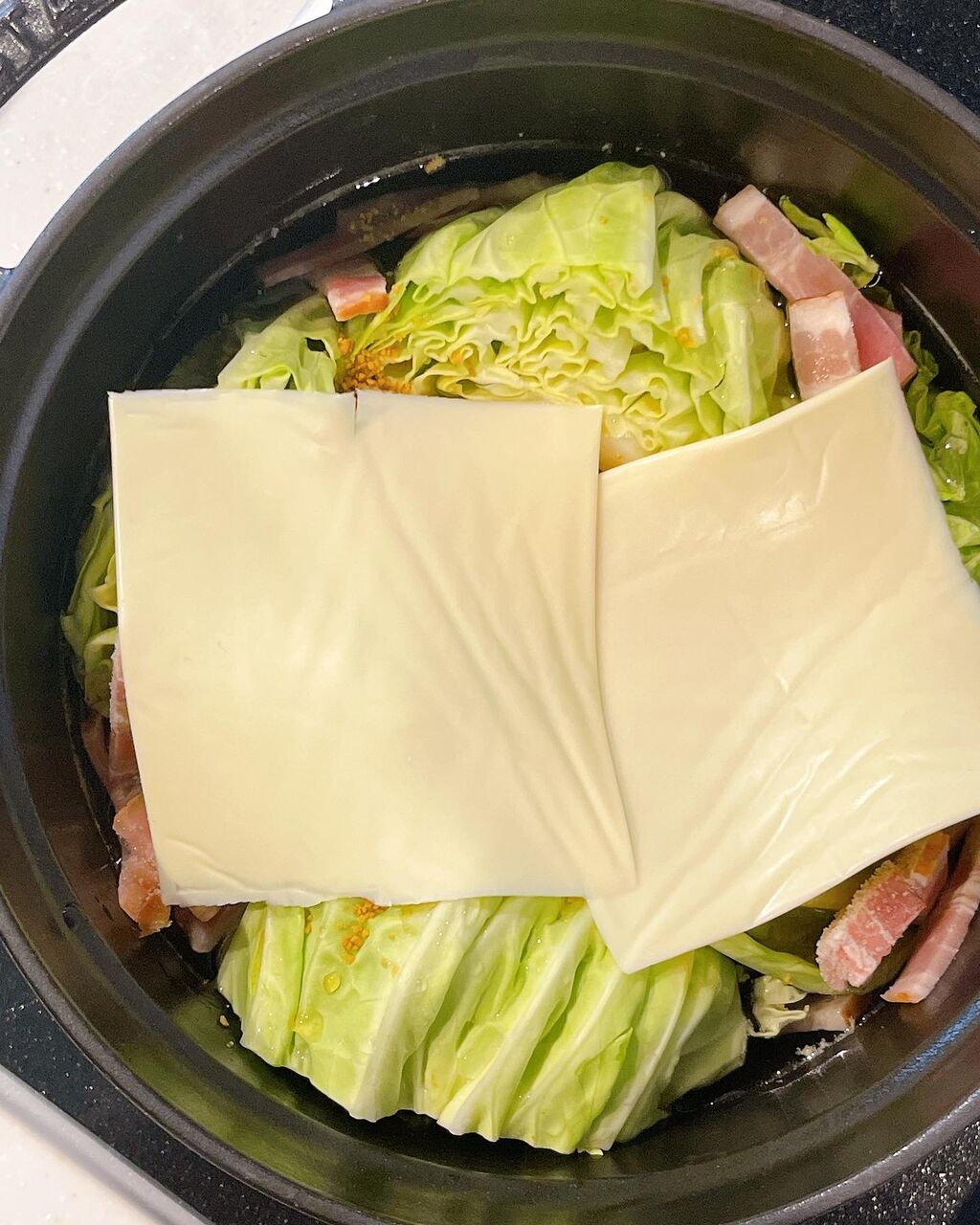 1.厚手の鍋にキャベツを置いてベーコンを散らしたらAを加えてスライスチーズをのせる。