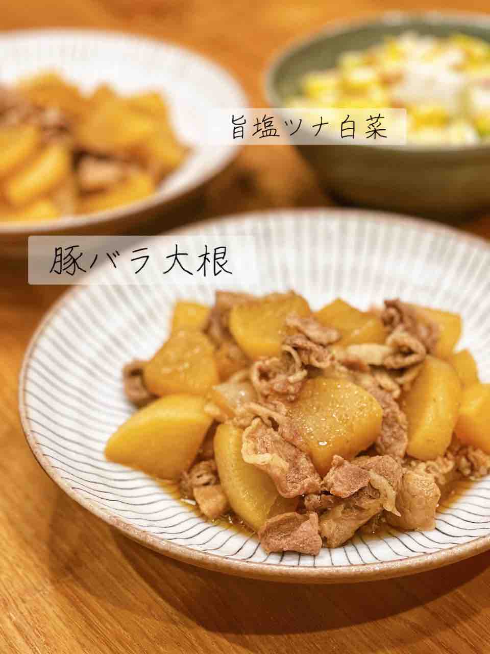なんだかバタバタで疲れていたので、晩ご飯は先日作ったうま塩白菜と、ストウブに入れてほったらかしにした豚バラ大根、もやしとコーンの味噌汁、鮭ごはん。
