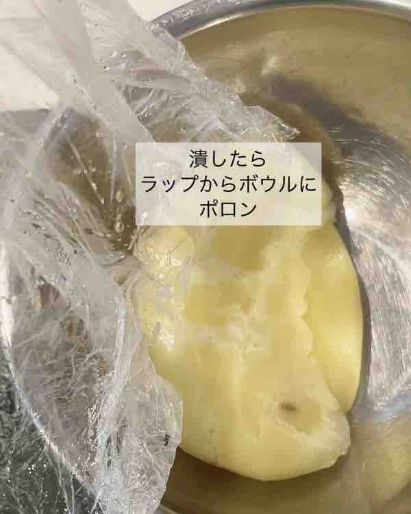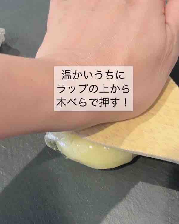 じゃがいもを丸ごとラップで包んでチンしたら、ラップを外さずにそのまま木べらやフライ返しなどで押し潰す!