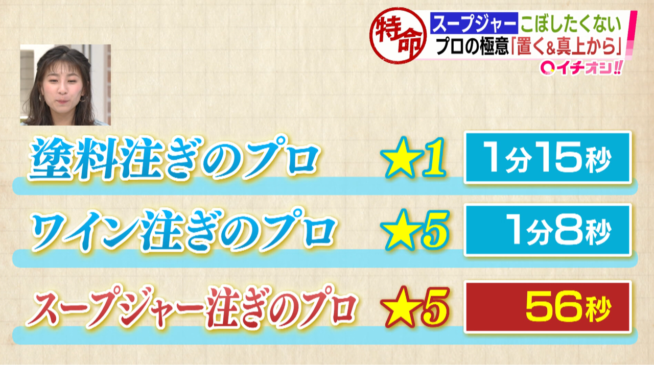 「注ぐプロ」の3人の注ぎテクで実際に視聴者の方が注いで、誰の注ぎテクが早く綺麗に注げるかを競うというもの。