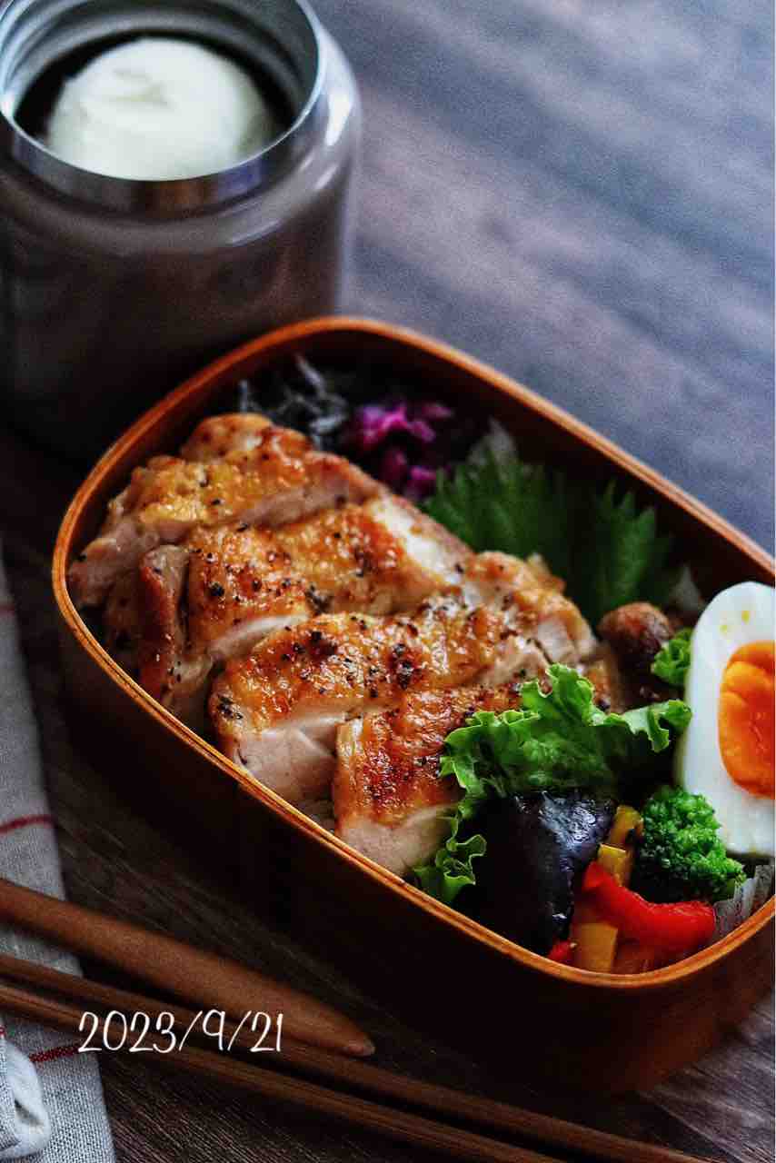 さてさて、今日の高校生男子弁当は、私が勝手に「魔法のスパイス」と呼んでいるGABANプロブレンドスパイスを振って焼いただけのチキンソテー弁当。