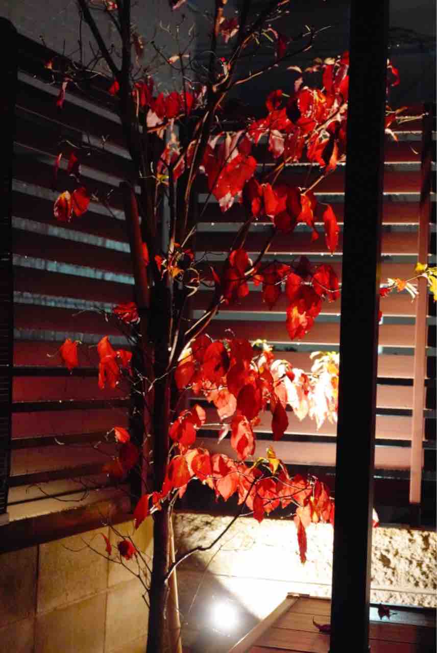 我が家の庭のすみにハナミズキが植えてあるんだけど、今、葉っぱが赤くてライトアップした夜は特に綺麗です。