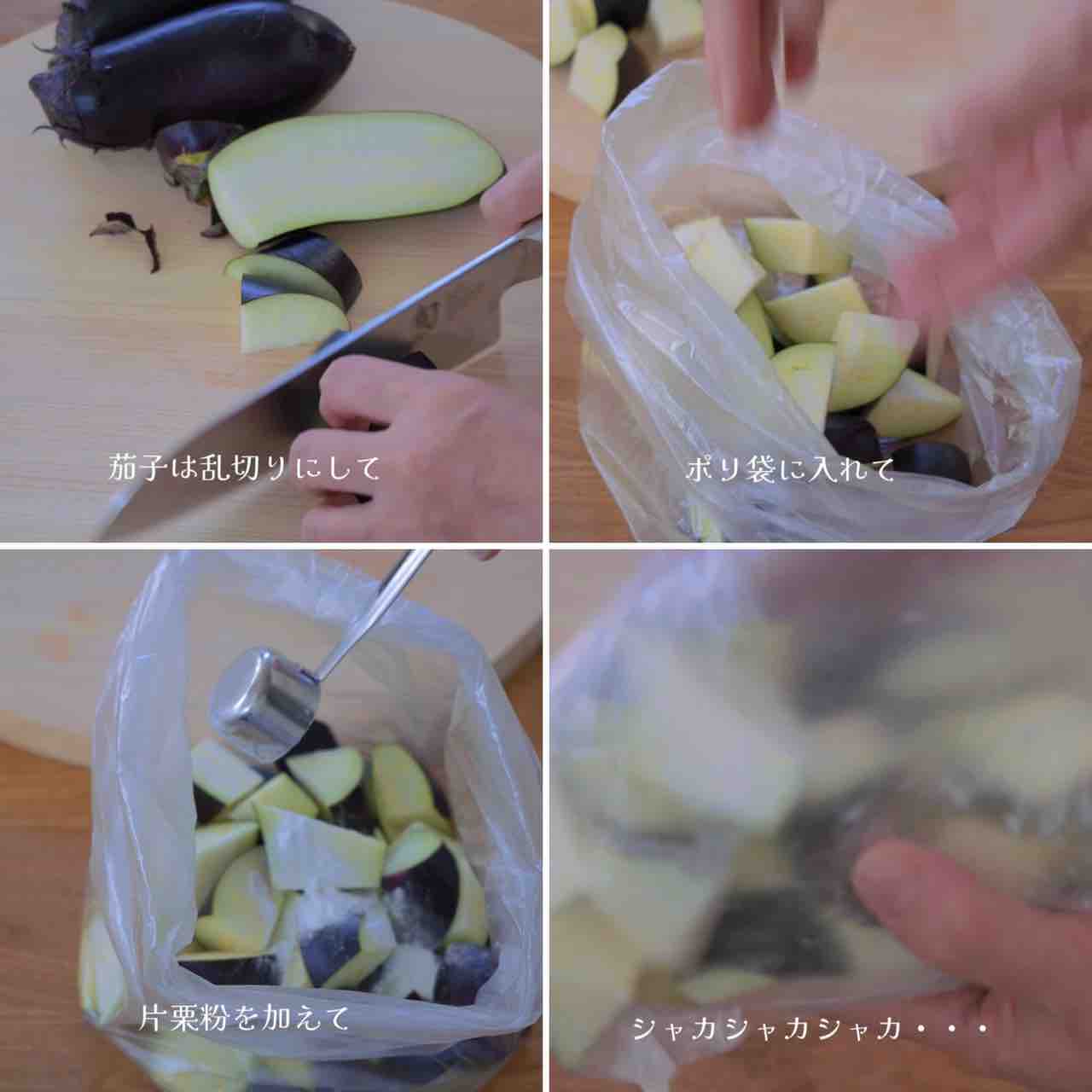 1.ポリ袋に茄子と片栗粉を入れて振り全体に片栗粉をまぶす。